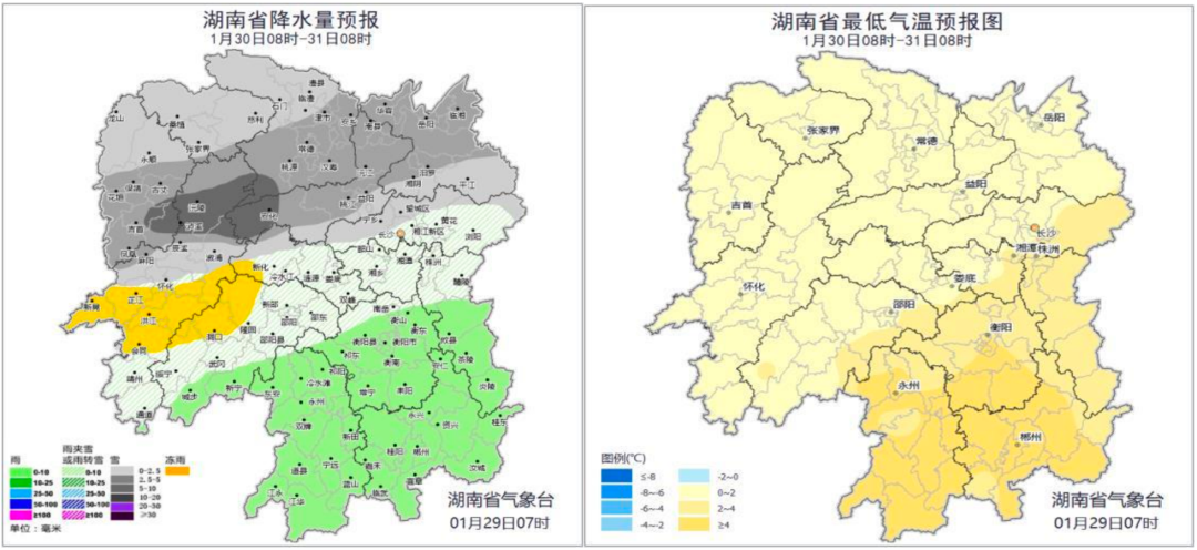30日白天至晚上,湘中以北雨夹雪转小到中雪,其中湘西州南部、怀化北部、常德南部、益阳西部局地大雪,怀化中部、娄底西部、邵阳北部有冻雨,其他地区多云转小雨;最低气温湘中以北0~2°C,其他地区2~4°C。
