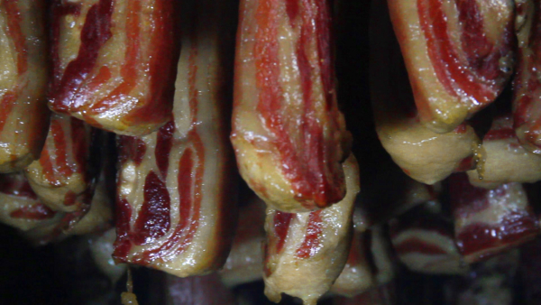 在企业的标准化熏制车间,经过腌制的新鲜猪肉需要在这里经过近一个月的慢熏。为应对生产销售旺季,企业提前扩充了生产团队,从今年1月开始,腊肉产量已达到100吨,订单排到了春节后。
