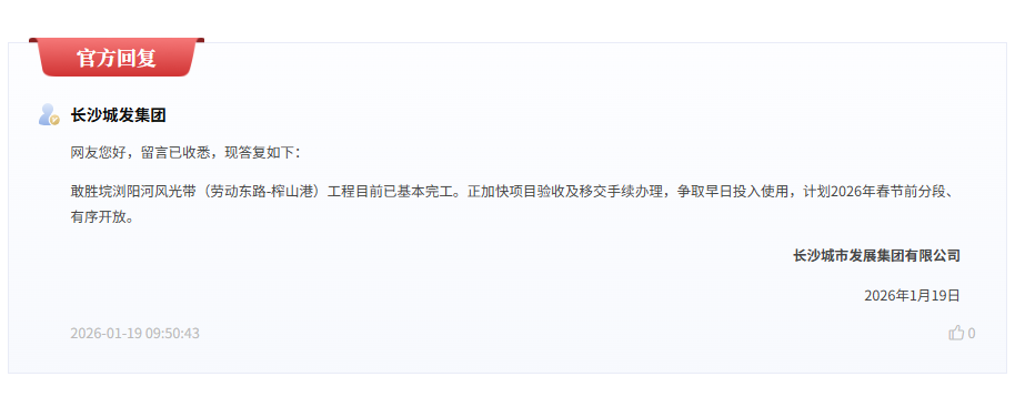 对此,长沙城发集团作出公开回应,表示敢胜垸浏阳河风光带(劳动东路至榨山港)工程目前已基本完工。当前正加快推进项目验收及相关移交手续办理,争取早日向市民开放。根据计划,该段风光带将于2026年春节前分段、有序开放使用。