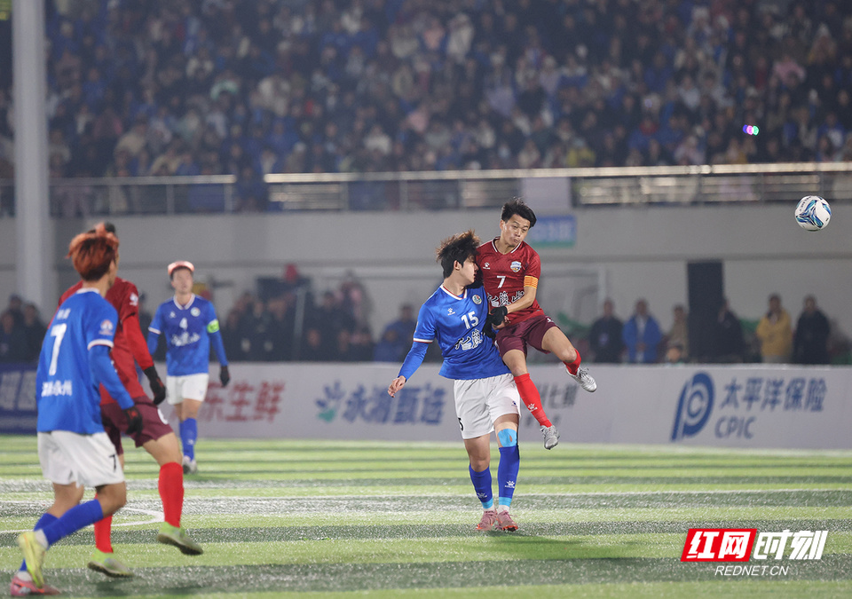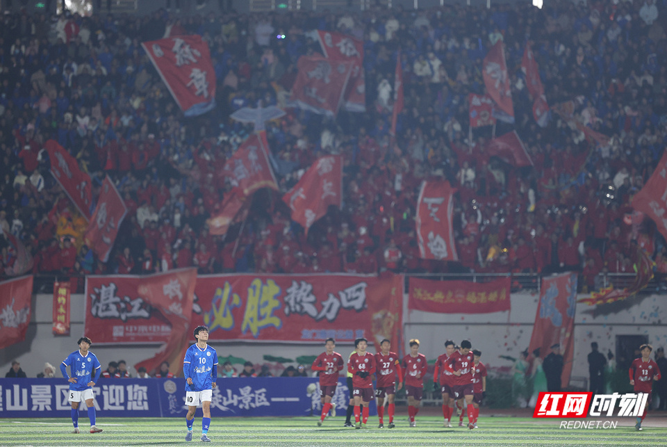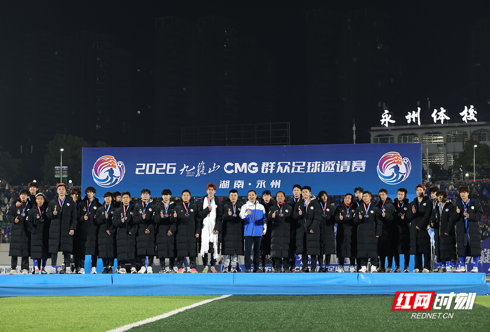 红网时刻新闻1月25日讯(记者 陈杰 周雨墨)2026九嶷山CMG群众足球邀请赛1月24日在永州市体育场收官。当晚的决赛在东道主永州队与广东湛江队之间展开。经过九十分钟激战,湛江队凭借上半场尾声阶段两分钟内连入两球的闪电攻势,以2-1击败永州队,成功捧起冠军奖杯。永州队奋力反扑未果,获得亚军。