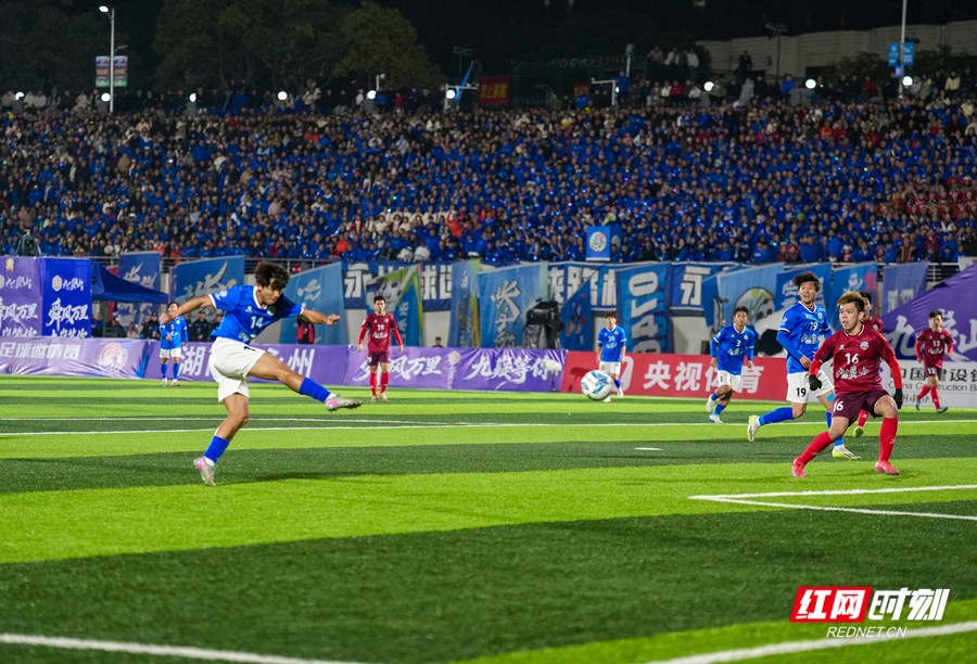 19时35分,决赛正式开始,永州体育场座无虚席、气氛热烈,16020名球迷到场观赛。决赛从一开始便进入高节奏对抗,主场作战的永州队试图抢占先机,但湛江队凭借娴熟技术与流畅配合始终掌控场上节奏。比赛第37分钟,湛江队6号陶智略抓住机会门前推射破门,湛江队1:0领先永州队。仅两分钟后,湛江队禁区外远射造成门将脱手,陶智略机敏补射梅开二度,将比分扩大为2:0。