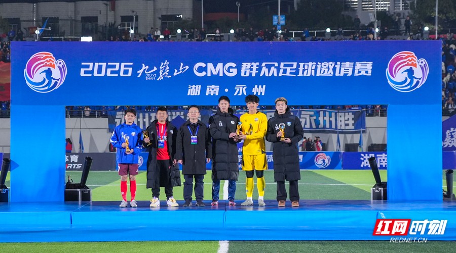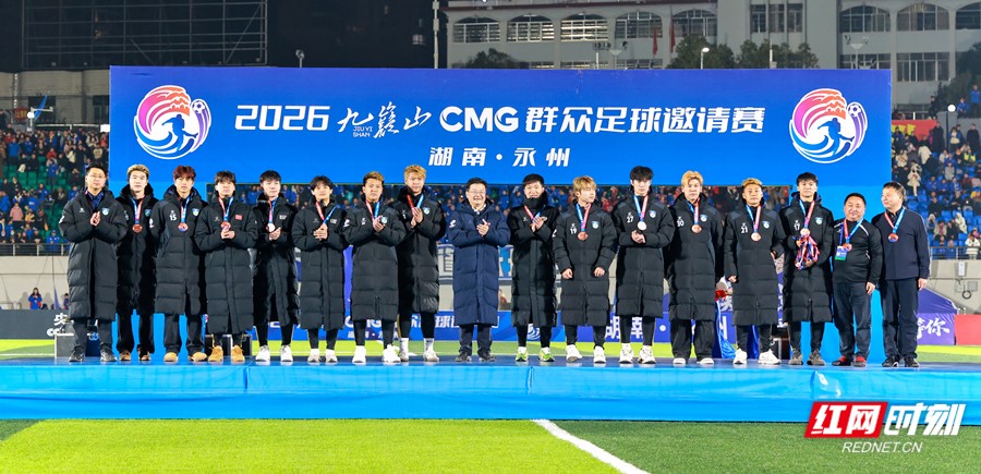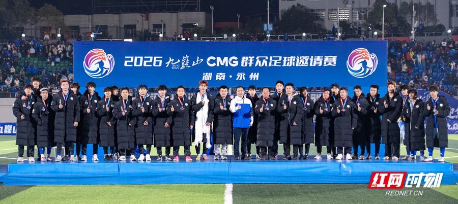 红网时刻新闻1月25日讯(永州融媒记者 陈小波 袁志圣 文佳星)1月24日晚,2026九嶷山CMG群众足球邀请赛决赛在永州市体育场举行。经过90分钟的鏖战,最终广东湛江队以2∶1战胜湖南永州队,夺得CMG群众足球邀请赛冠军,湖南永州队获得亚军,山东泰安队获得季军。湖南省政协副主席、民盟省委会主委何寄华,中央广播电视总台体育青少节目中心党委书记吕逸涛,市委书记朱洪武,市委副书记、市长陈爱林,中央广播电视总台湖南总站站长朱兴建等观看比赛并颁奖。