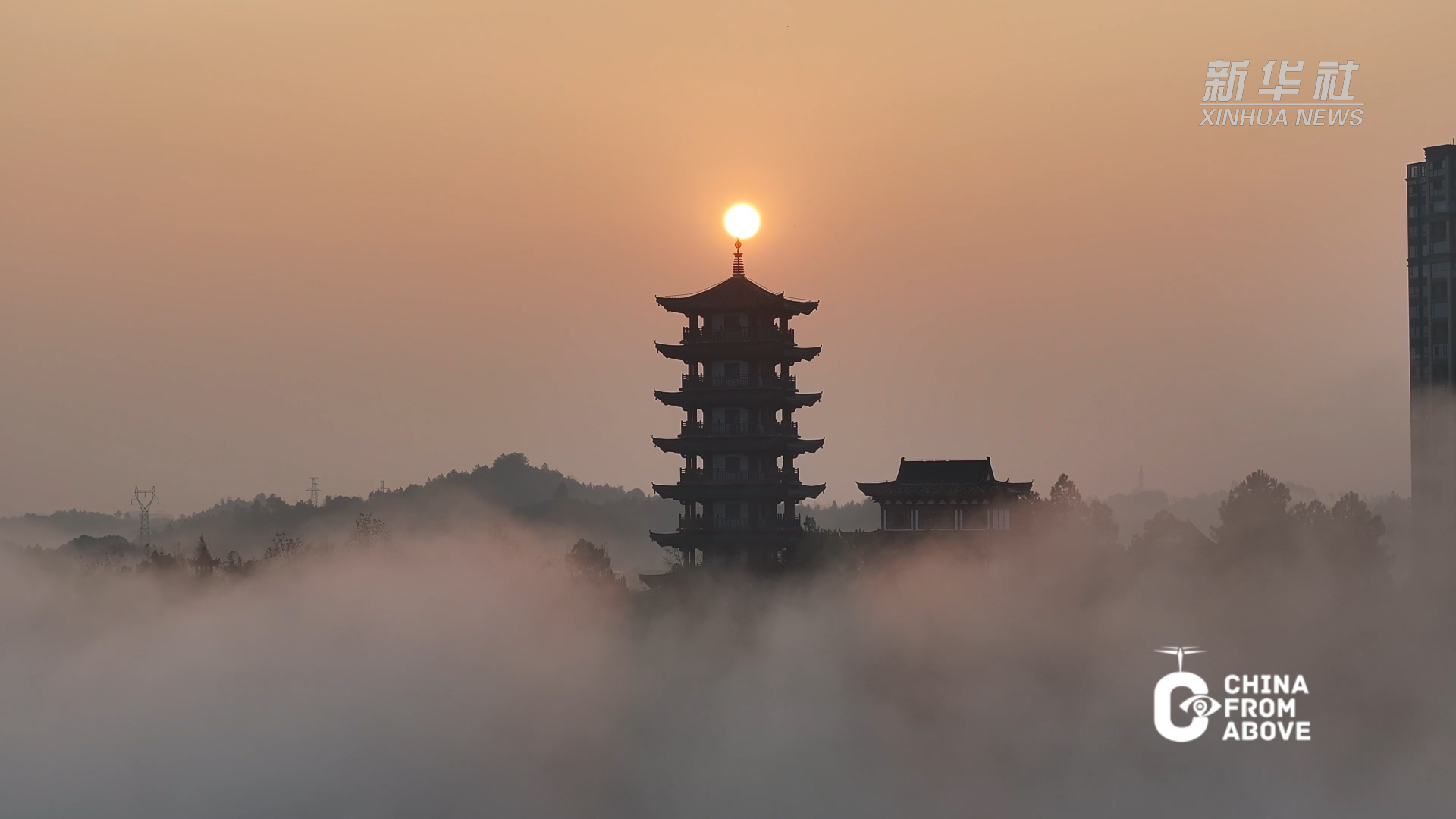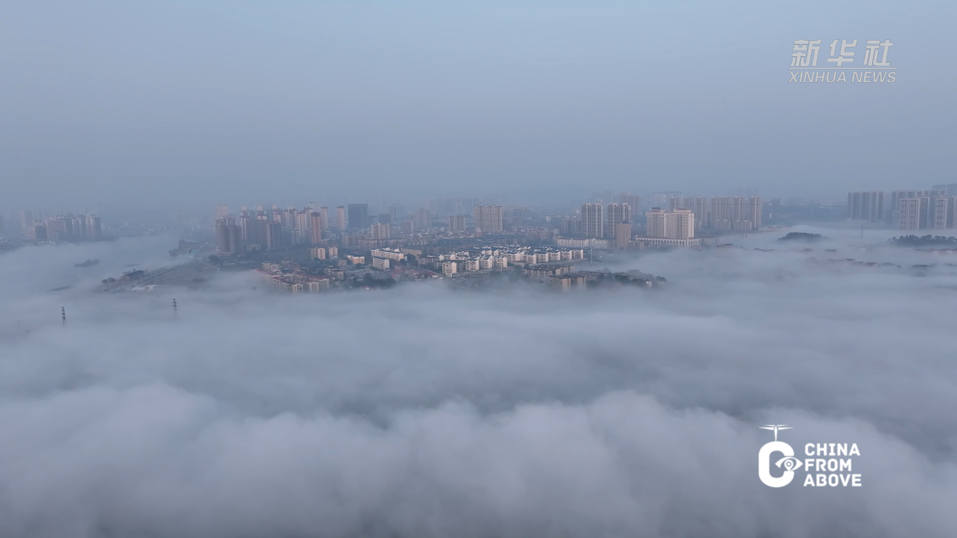 从高空俯瞰,晨曦穿透薄雾洒向大地,城市楼宇错落其间,江上桥梁车水马龙,宛若“天空之城”,令人沉醉。