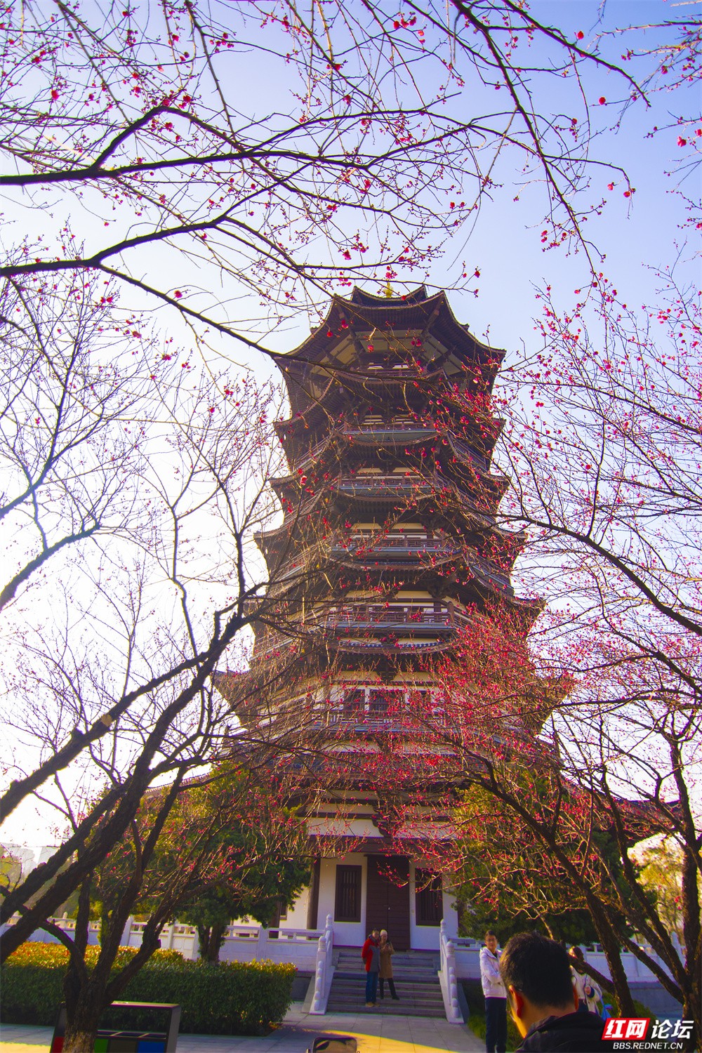 镜头推近,是枝头胭脂色的特写——从圆润的朱砂苞,到层层绽开的绢纱瓣,每一点红都铆足了力气,在苍劲的褐枝上燃起暖意。镜头拉远,是诗画交融的幕布。白鹭塔静立其后,飞檐斗拱与梅枝一刚一柔,一古朴一鲜活,在湛蓝天幕下定格成东方意境。游人的身影恰好入画:有人着长裙悠然走过石径,任花影拂过肩头;有人举起相机,在取景框里寻找着与春天最近的距离。