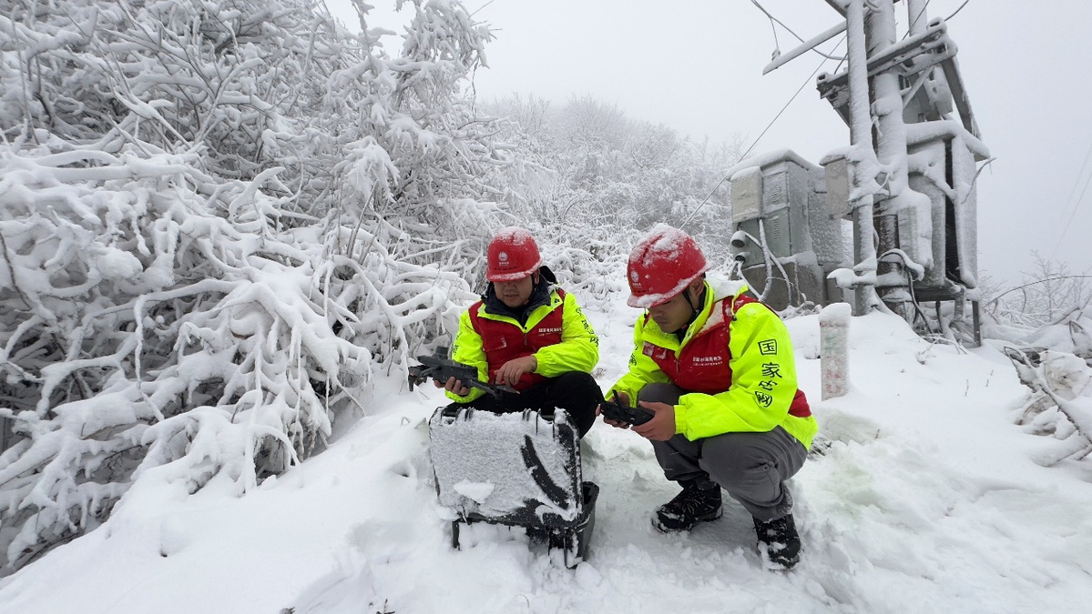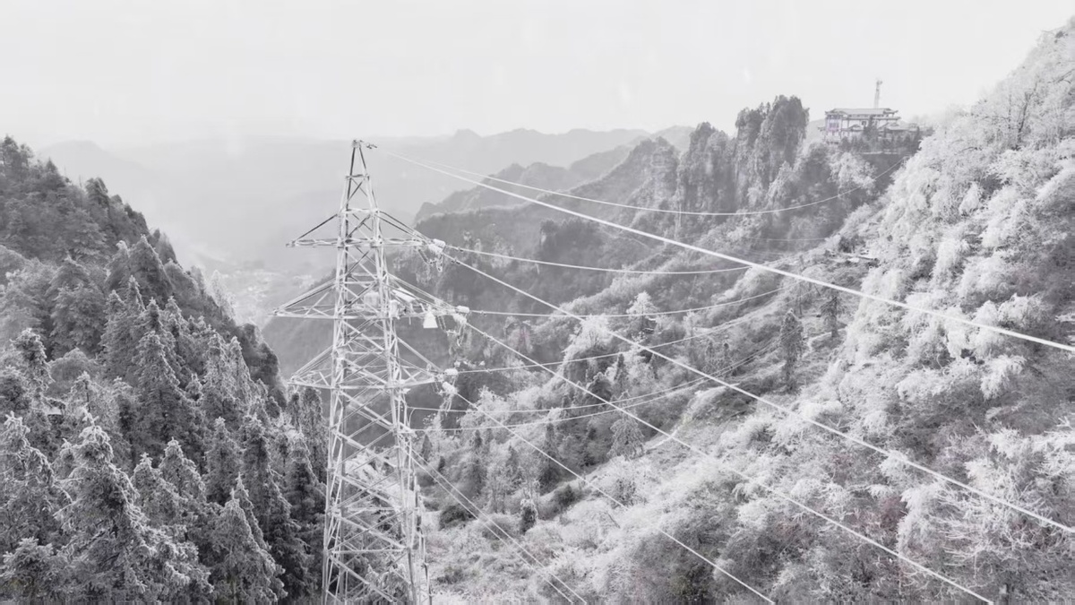 在武陵源片区,天子山观冰哨巡检人员携带无人机、测温仪和覆冰厚度尺,翻越崇山峻岭,用无人机对高压输电杆线进行可视化巡检,对地面基铁塔展开细致检查,查看铁塔是否遭遇外力撞击受损,输电导线覆冰厚度,为后续融冰处理提供科学依据。