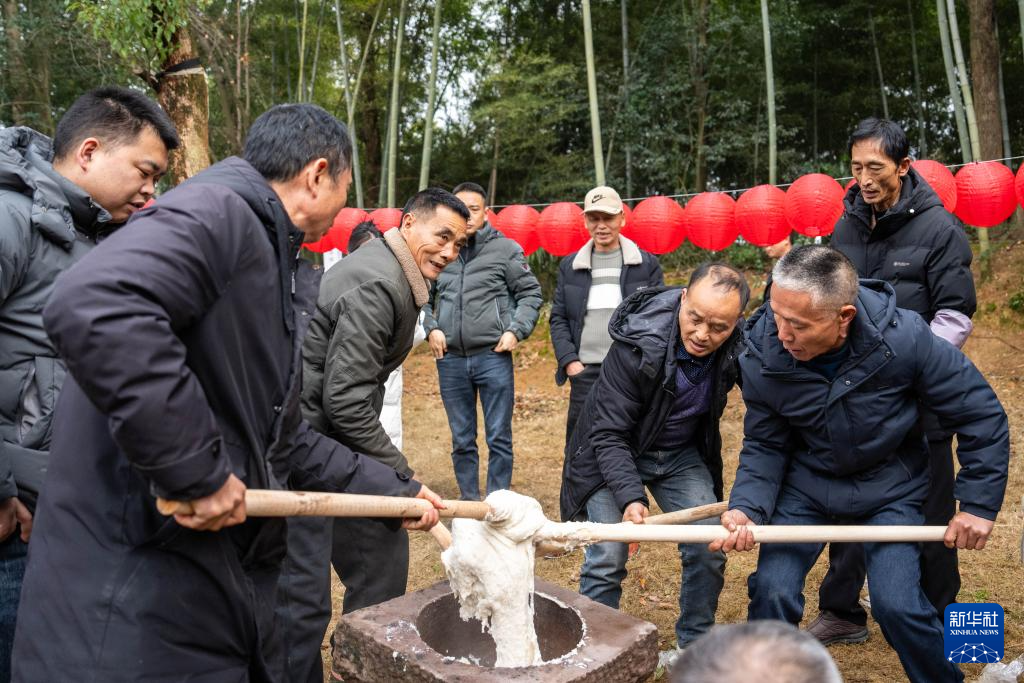2月10日,村民在谢家铺镇港中坪村参与打糍粑大赛。