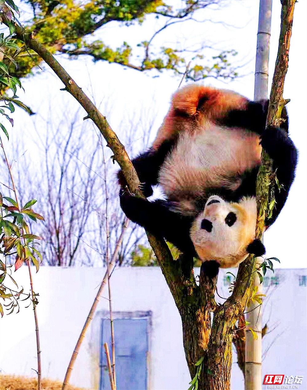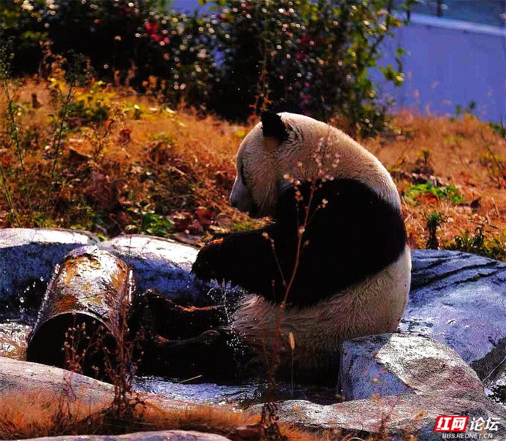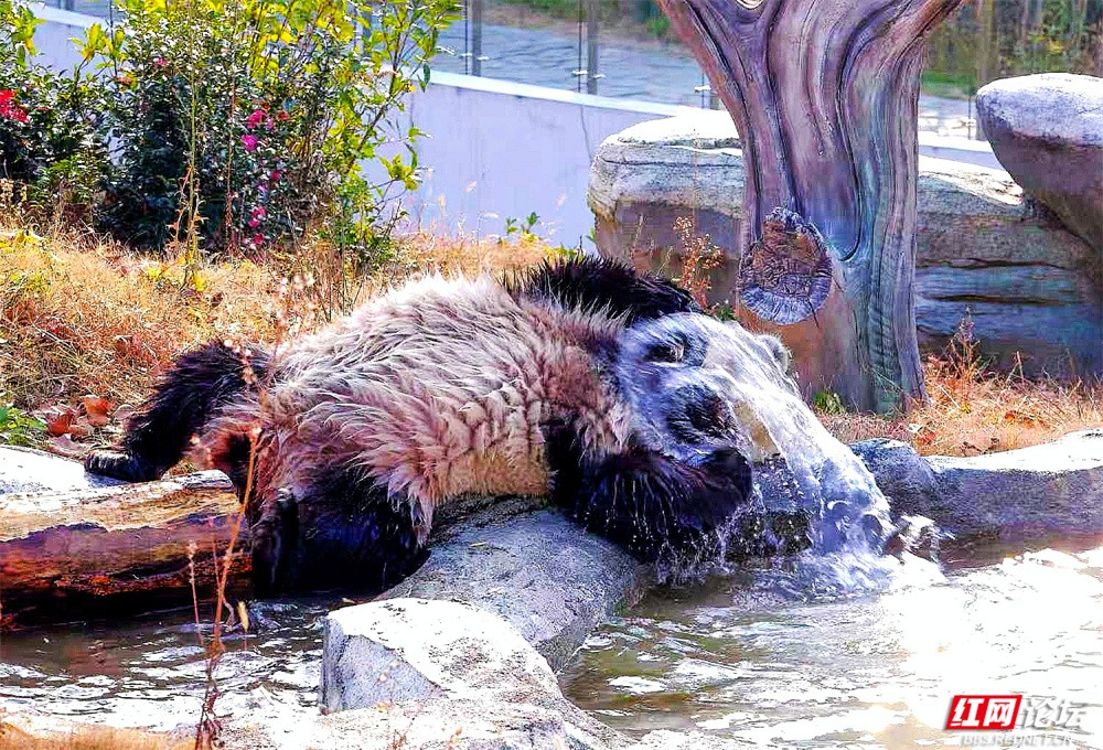 它们或坐在青灰色岩石上,抱着竹竿专注啃食;或趴在木亭柱头,好奇地打量世界;有时蜷在石块间嬉戏,有时又悠闲地挂在树枝上,甚至表演起“倒挂金钟”的绝活。每一幕——低头玩水时溅起的水花,坐在树干上悠闲惬意,连廊下玻璃内外相望的瞬间——都被时光悄悄定格。
