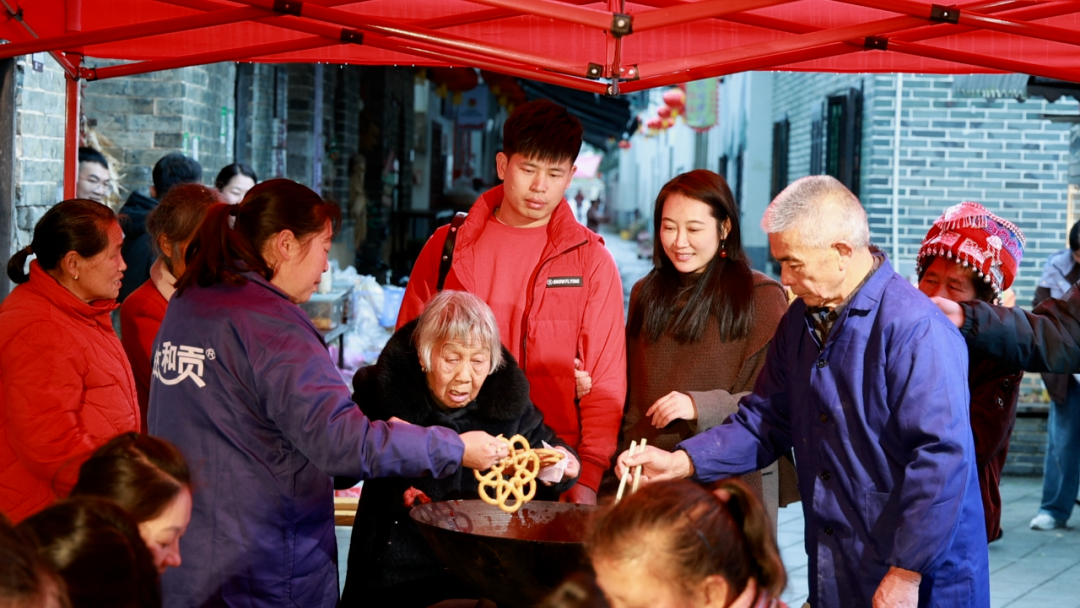 村民与游客欢聚一堂,一同抖糍粑、炸套花,在传统年俗中回望“记忆里的春节”。民俗广场上,木槌起落间糯米翻滚,大家你一棒、我一棒默契配合,热气氤氲、香气扑鼻,刚打好的糍粑软糯香甜,孩子们捧在手中,笑容格外灿烂。一旁的炸套花现场同样热闹,热锅中的油滋滋作响,香气漫溢古巷。
