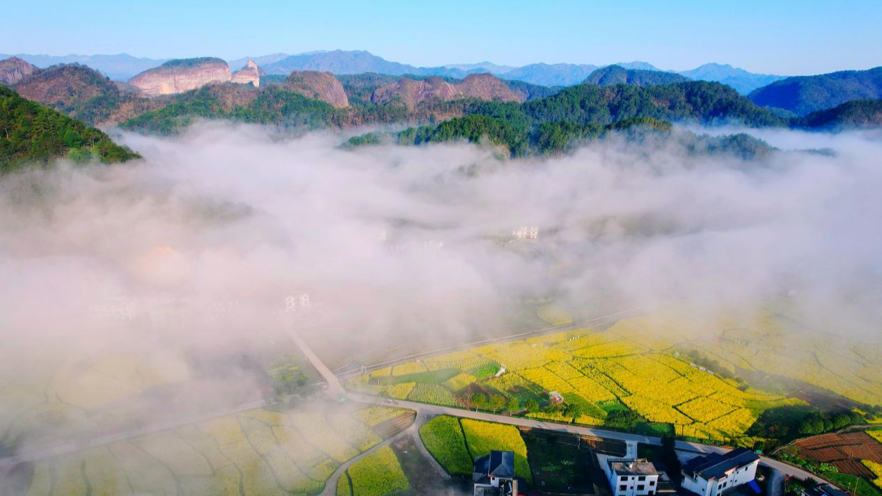 晨光漫过丹崖,花海更显明媚。金黄花田顺着山势铺展,与赤壁丹崖刚柔相济、冷暖撞色,蜂蝶在花间翩跹,清风过处卷起层层金浪,花香混着泥土的清新扑面而来,让人心旷神怡。登高远眺,峰林如黛、花海鎏金,夫夷江畔绿意初绽,山水田园融为一体,尽显春日崀山的灵秀与壮阔。