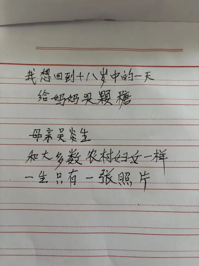 过年了爷爷也像个孩子一样,想起了母亲的拿手菜:蒸藕,蛋饺子……“那是我吃过的最好吃的东西。”爷爷说。他在信纸上写下:“我想回到十八岁中的一天,给妈妈买颗糖。妈妈吴炎生,和大多数农村妇女一样,一生只有一张照片。”