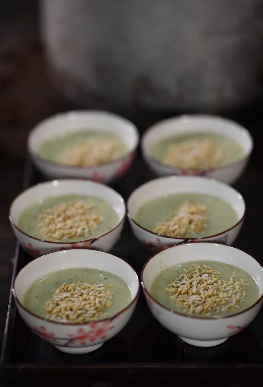将生米、生姜、老毛叶(茶树上较老的茶叶)