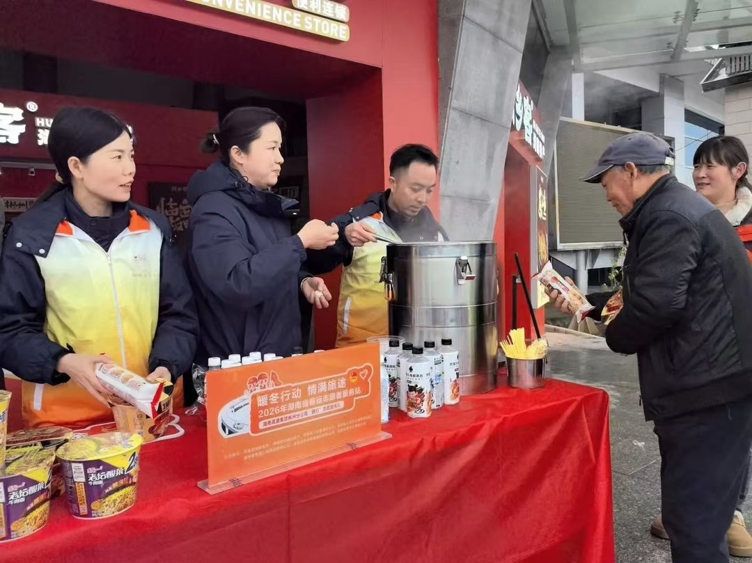 春运仍在继续,温暖从未停歇。在湖南高速“路灯”品牌引领下,各服务区内“暖意”融融,“送温暖、优服务”系列活动持续开展。一杯热姜茶、一桶方便面、一份应急药品、一件修车工具,还有一张张冬季行车安全提示卡……点滴细节,为南来北往的司乘人员驱散旅途寒意。
