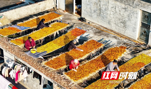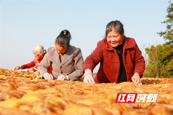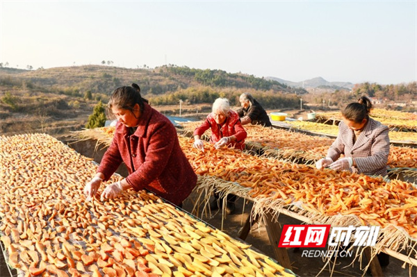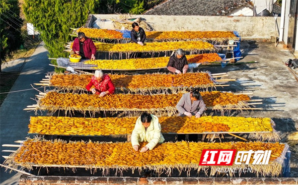 红网时刻新闻1月15日讯(通讯员 刘贵雄 陈祉凝)1月14日,湖南省永州市新田县枧头镇大观堡村,村民在晾晒红薯干。近年来,湖南省永州市新田县利用土地富硒资源优势,积极引导农民发展红薯种植产业,引进云雾薯品种,采取“公司+基地+农户”模式作为“一村一品”的产业发展种植,通过深加工成红薯干等特色农产品在线上线下销售,带动村民增收致富,助力乡村振兴。