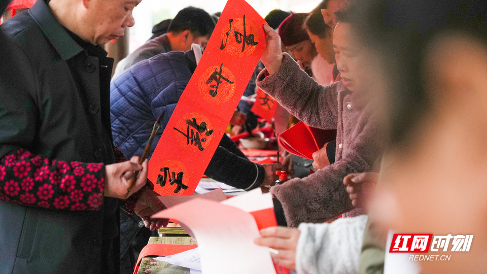 现场,书法爱好者写春联送与群众。
