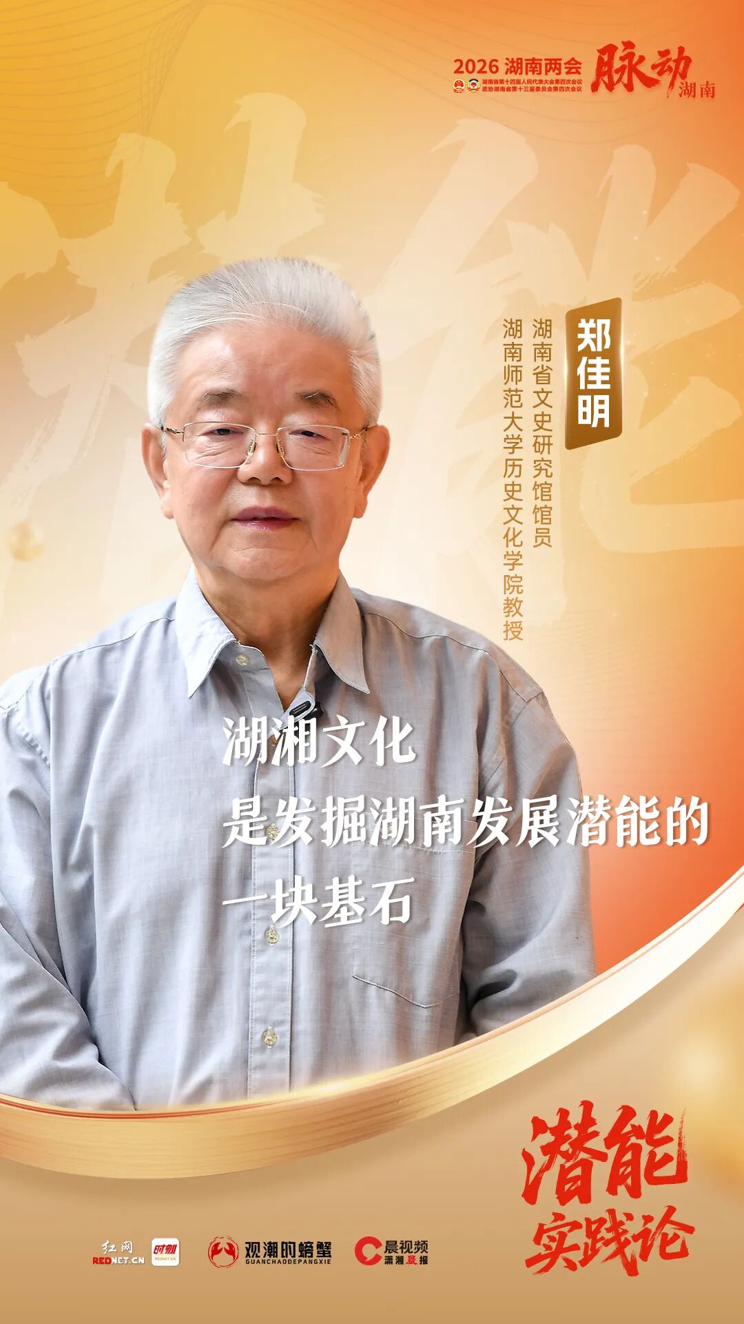 编者按:2026年湖南省两会召开之际,红网重磅推出6组政论体系列报道《潜能实践论》。系列报道除了“企业篇”和“政府篇”,还连线国内多位知名博主进行点评,从多维视角献策湖南。《潜能实践论》最后一组“文化篇”,特邀文化博主、湖南省文史研究馆馆员、湖南师范大学历史文化学院教授郑佳明进行点评。