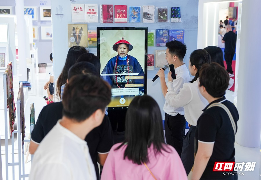 ▲第三十一届北京国际图书博览会湖南出版展台,AI智能互动体验区的读者正与“左宗棠”等历史名人跨时空交流。(杨旭/摄)