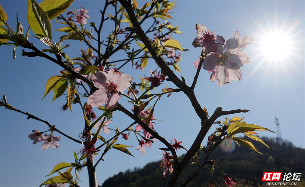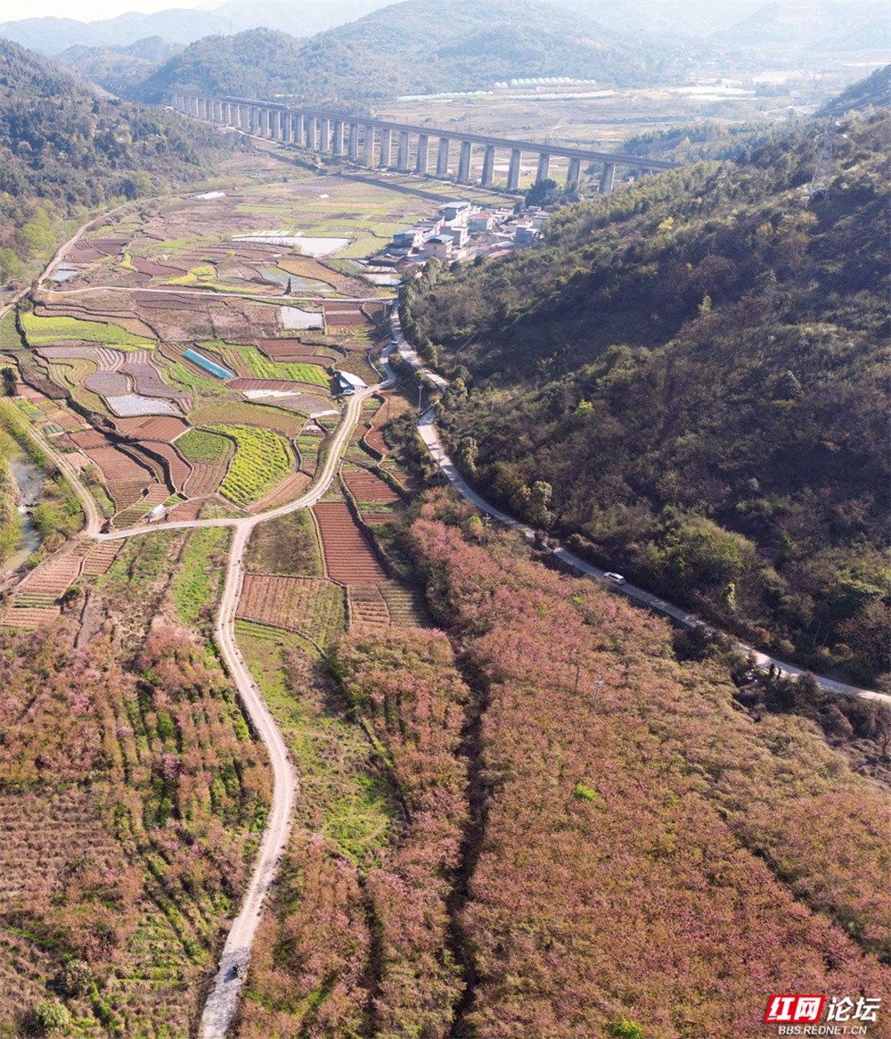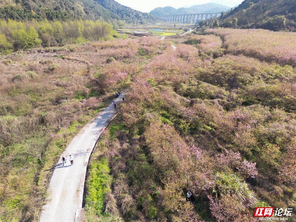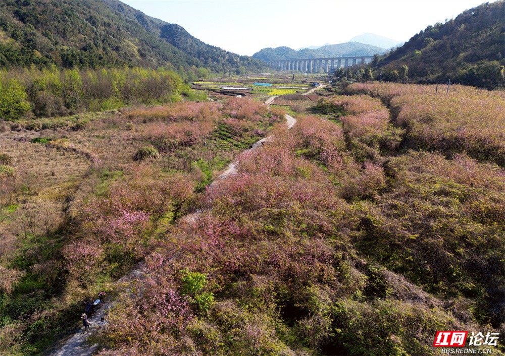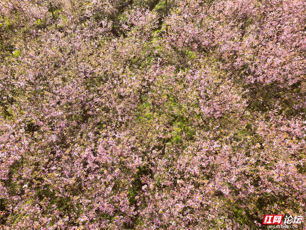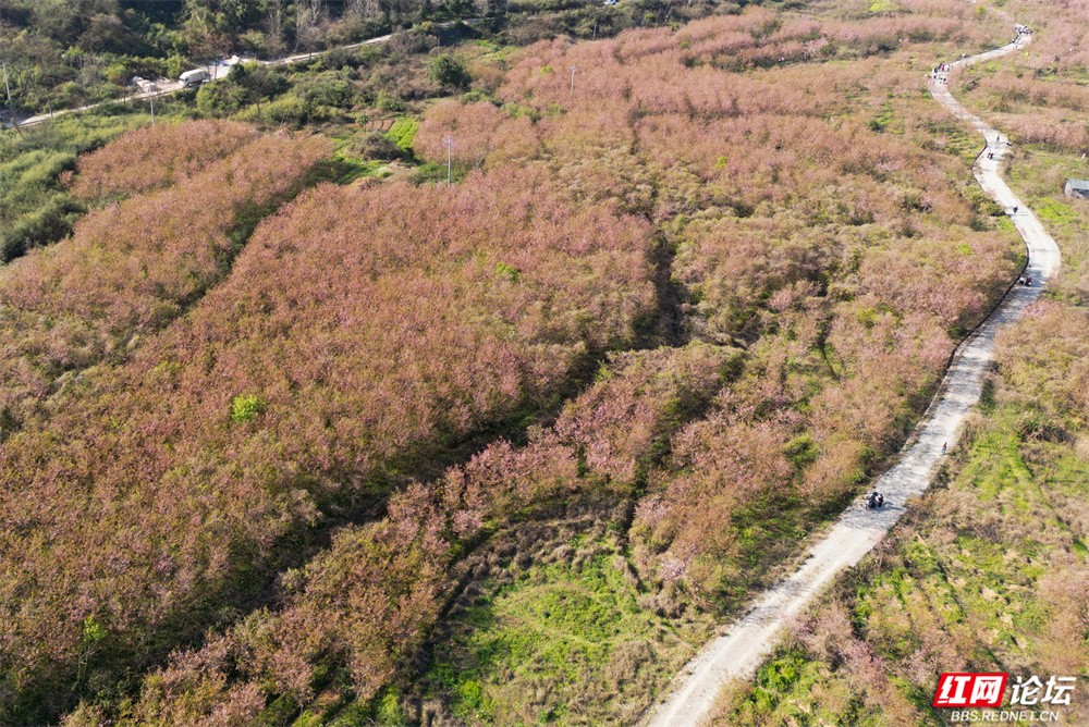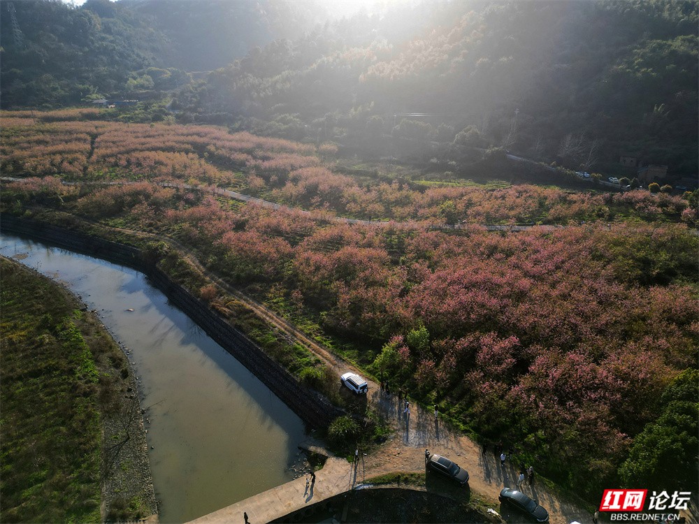 春风有信,花开有期。近日,郴州市北湖区石盖塘镇光明村的樱花,已如云霞般铺满山坡。上百亩粉樱盛放,随风轻摇,远山如黛,天空湛蓝,春日的光影在这里编织成一首温柔的诗。