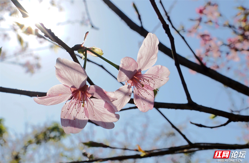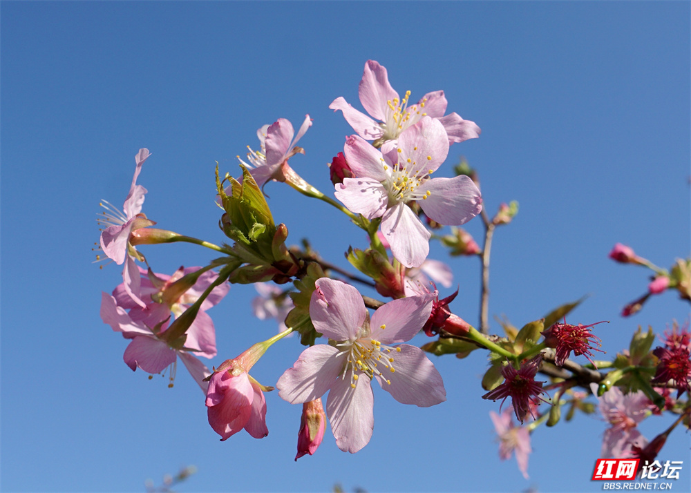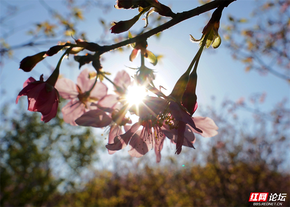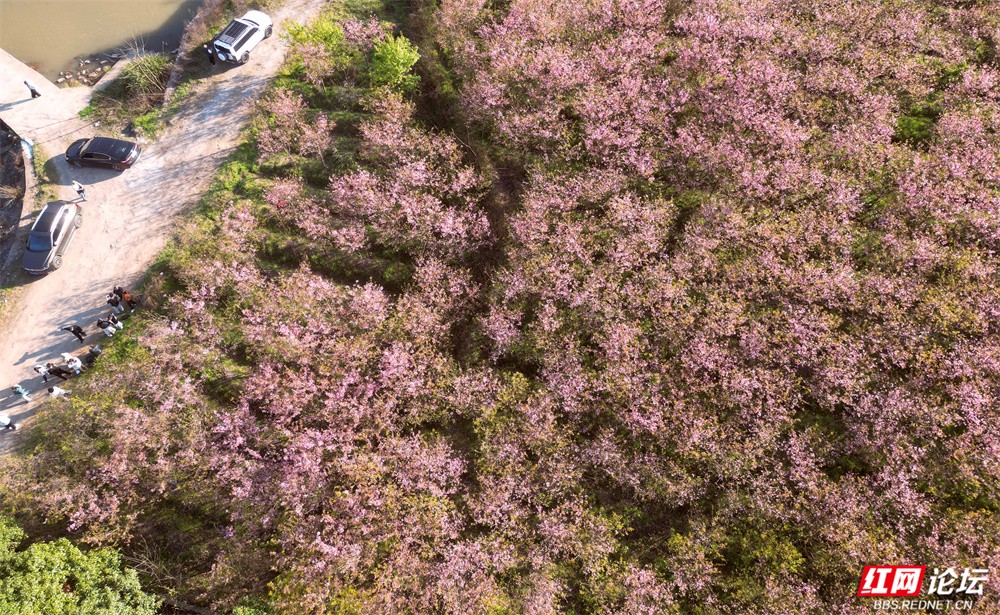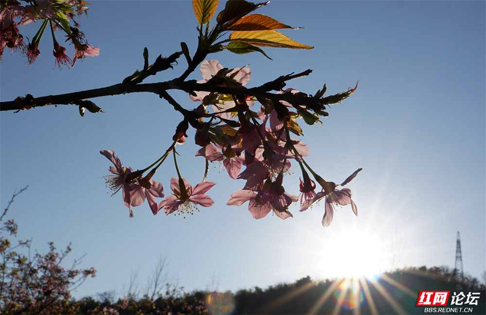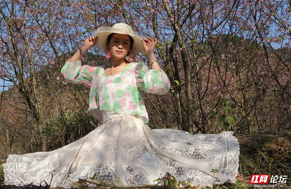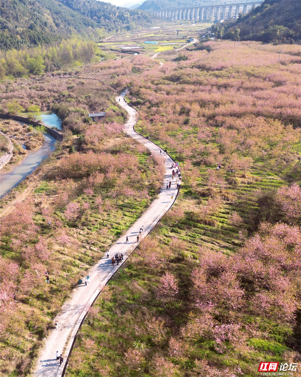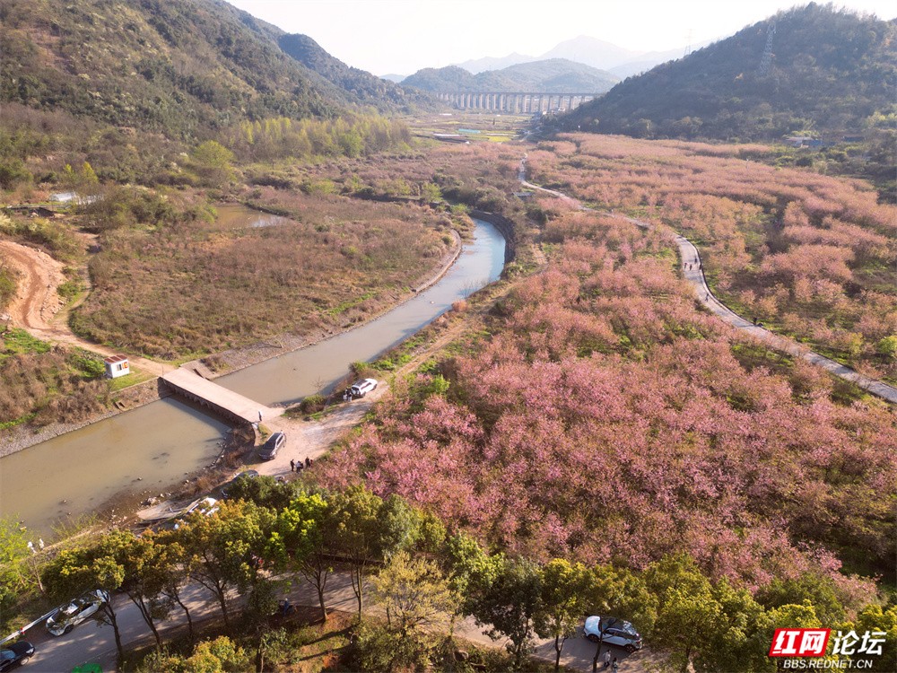 春风有信,花开有期。近日,郴州市北湖区石盖塘镇光明村的樱花,已如云霞般铺满山坡。上百亩粉樱盛放,随风轻摇,远山如黛,天空湛蓝,春日的光影在这里编织成一首温柔的诗。