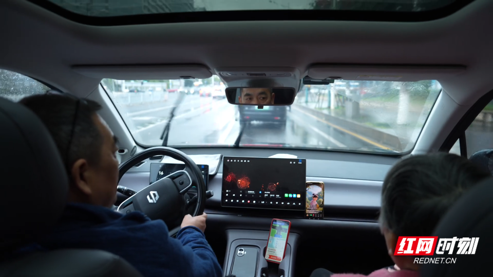 黄建明带着妻子,驾驶着网约车。