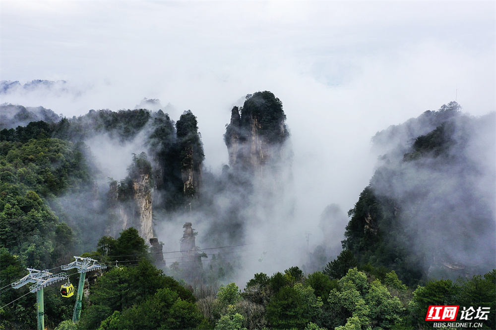 云雾自山谷蒸腾而起,轻柔地缠绕着每一座石峰。它们时而如薄纱拂过青翠的峰顶,时而如潮水般漫过深谷,将千峰万壑化作一幅徐徐铺展的灵动水墨。缆车在云霭间悄然滑行,为这幅浑然天成的画卷添上一笔恰到好处的人间烟火;而远处若隐若现的飞檐,则仿佛画中留白处的诗意落款。