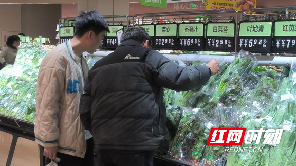 不远处的某大型超市内,蔬菜销售区同样人头攒动。油麦菜、菜心、红苋菜、兰头等时令鲜蔬分区分架摆放,叶茎饱满,色泽鲜亮,不少市民正仔细比对、精心挑选。据超市工作人员介绍,近期气温回升,蔬菜生长周期加快,上市量逐步加大,部分叶菜价格较春节期间降幅明显,有效满足了市民的日常消费需求。