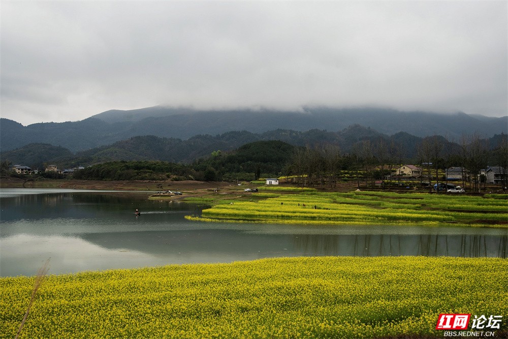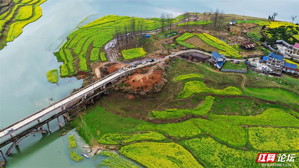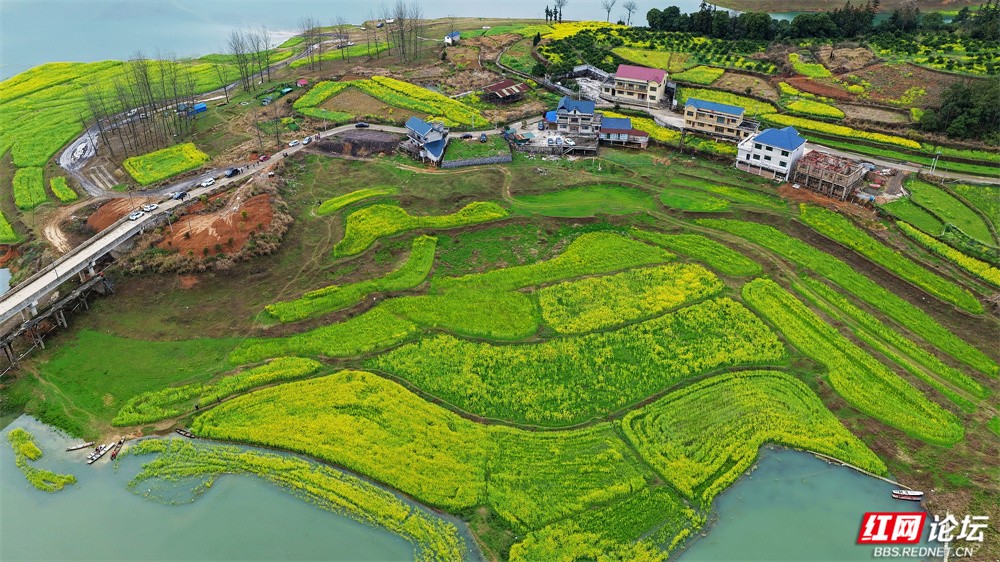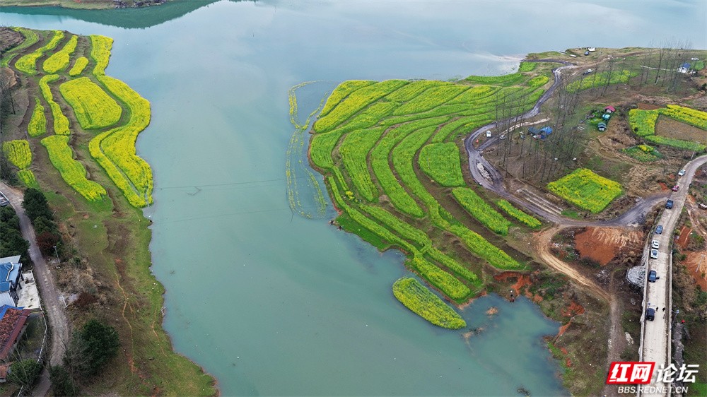 在怀化辰溪,藏着一处被称为“千岛湖”的秘境——长田湾水库。千余亩油菜花沿水岸铺展,金黄灿灿,如大地织锦。近日,库水悄然上涨,将部分花田轻轻揽入怀中。于是,油菜枝在水中翩跹,花影在波光间摇曳,水韵缠绕花海,勾勒出一幅流动的田园诗画。