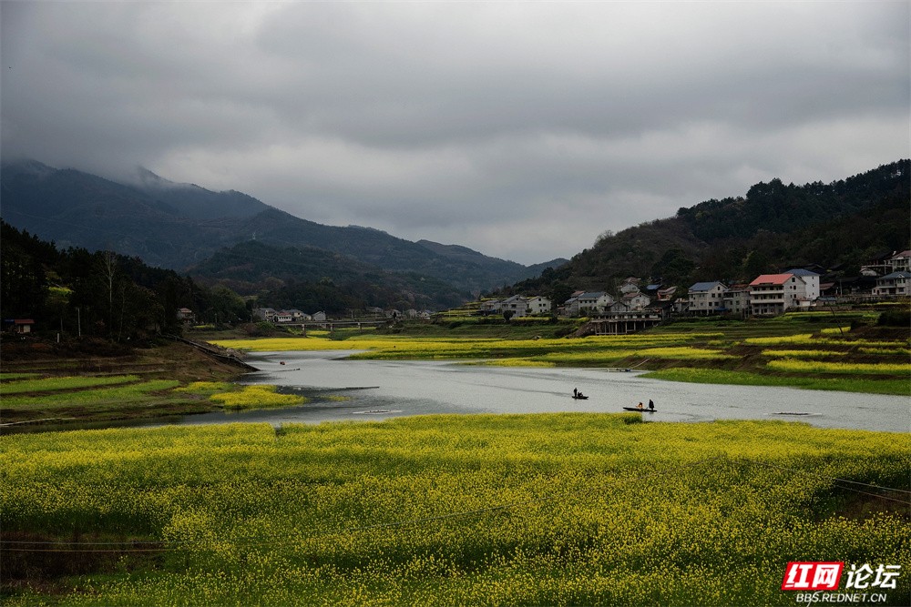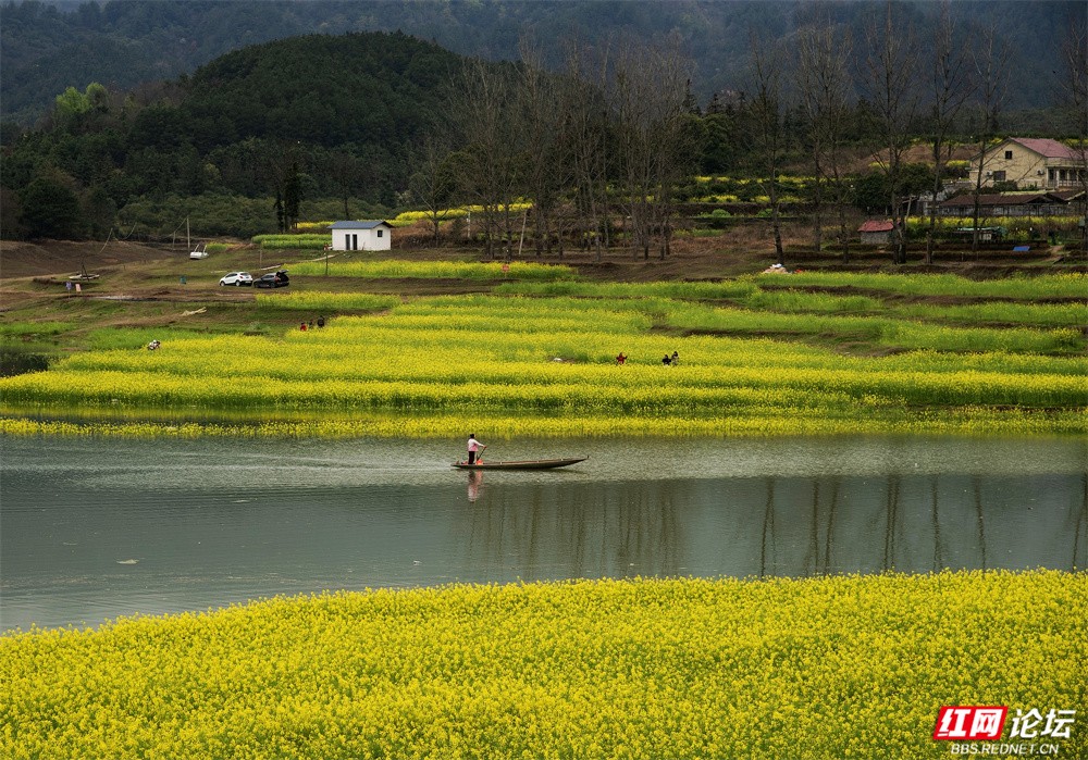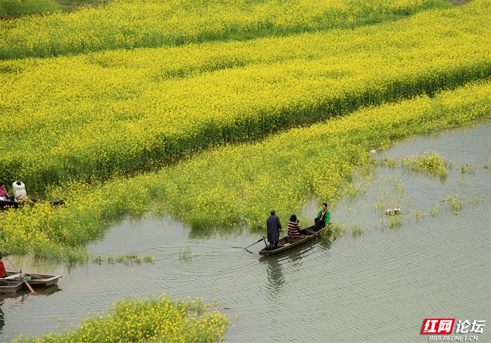 从空中俯瞰,金黄花田被绿埂与碧水分割成自然的板块;近处看,有人泛舟水上,有人漫步花径,也有人静静立在岸边,看柳枝低垂、远山含雾。这里吸引了远自省城的文人拍客,也迎来了四乡八邻的游人。人仿佛行走在岸上,心却早已随着水波与花香轻轻飘游。