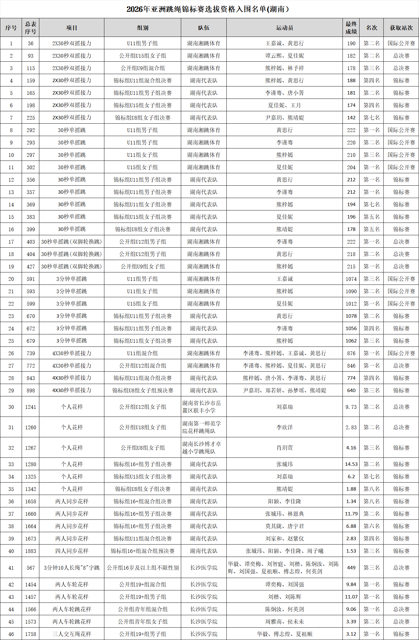 红网时刻新闻3月29日讯(记者 符洹雨 通讯员 刘如沛)近日,记者从湖南省跳绳运动推广委员会获悉,38名湖南跳绳健儿凭借在2025年全国跳绳联赛总决赛、全国跳绳锦标赛、中国国际跳绳公开赛等国家级赛事中的出色表现,成功获得2026年亚洲跳绳锦标赛的选拔资格。