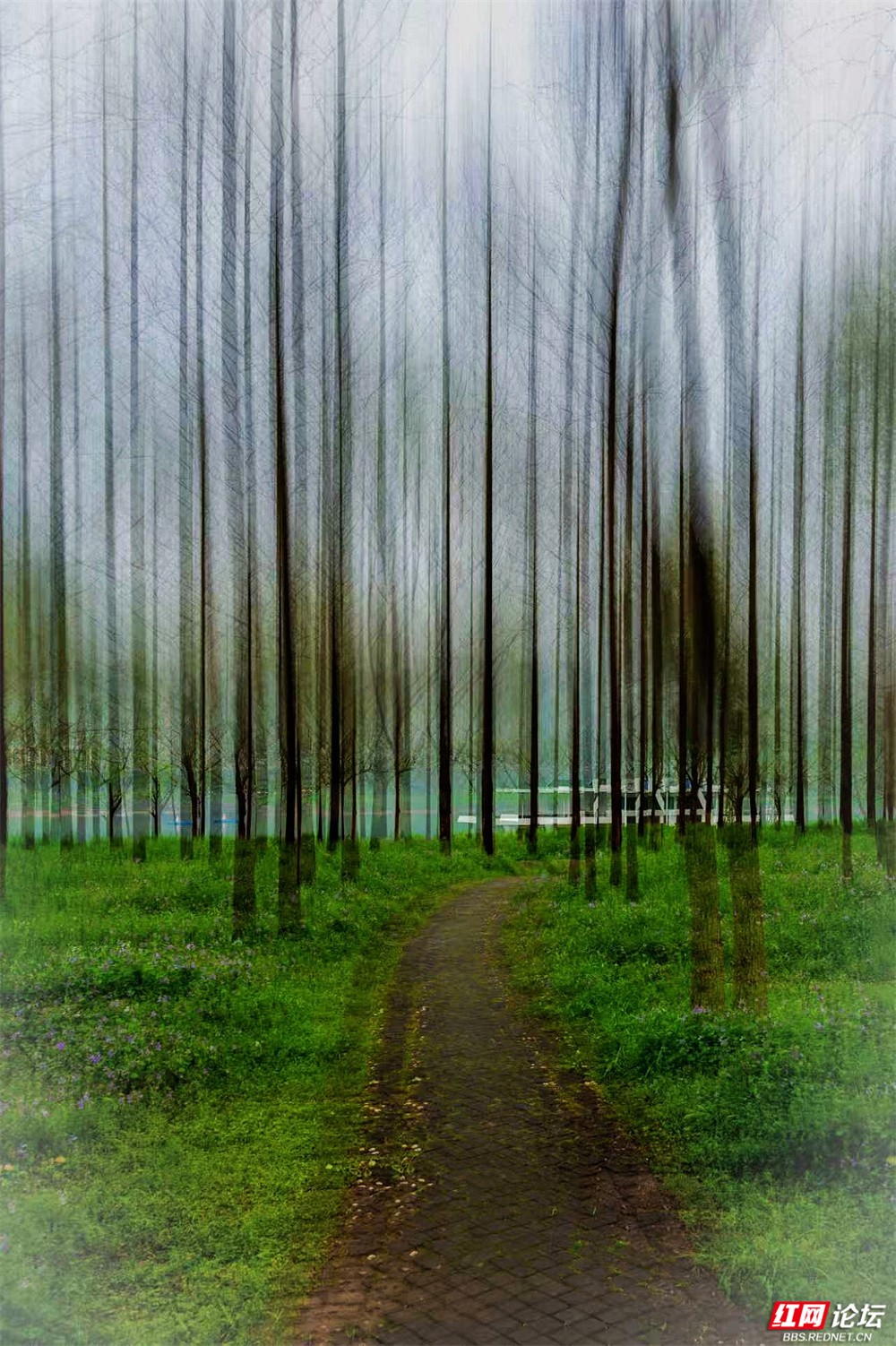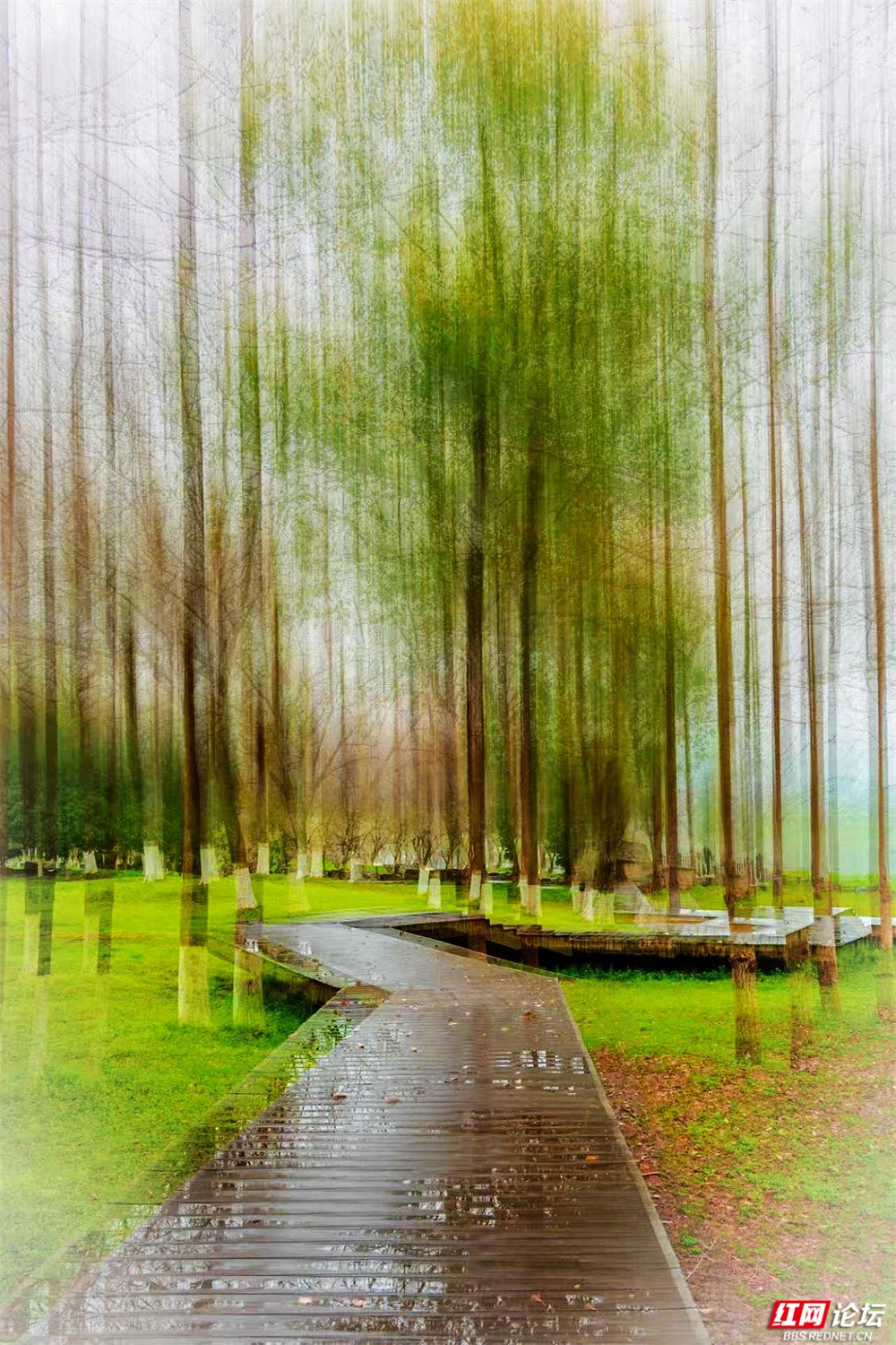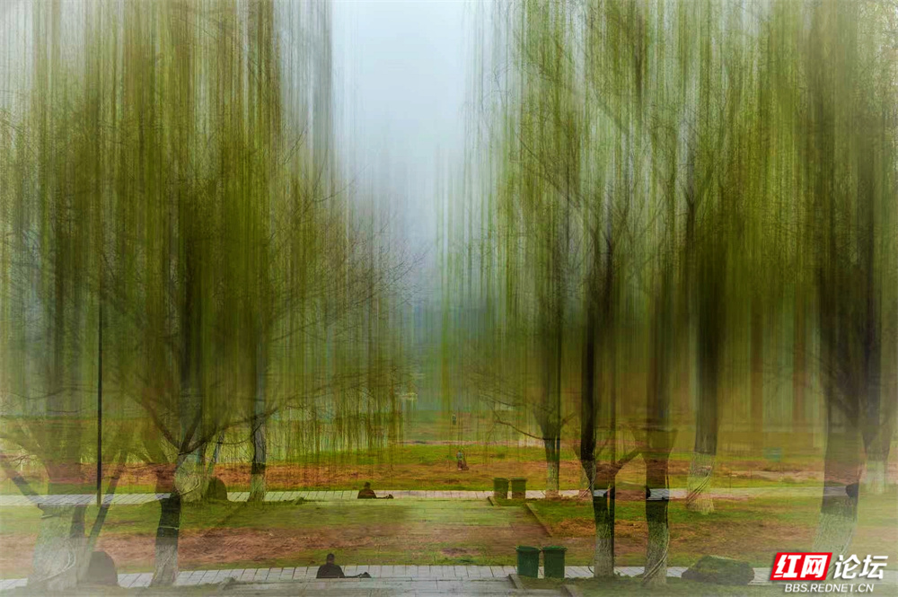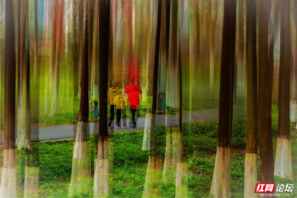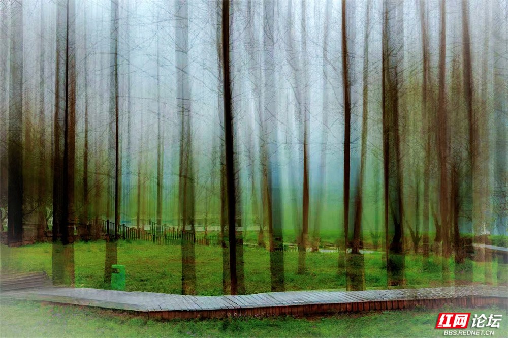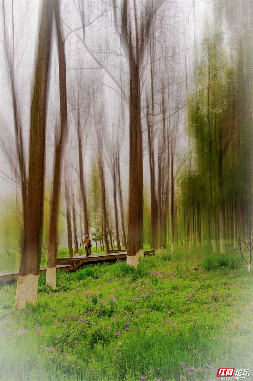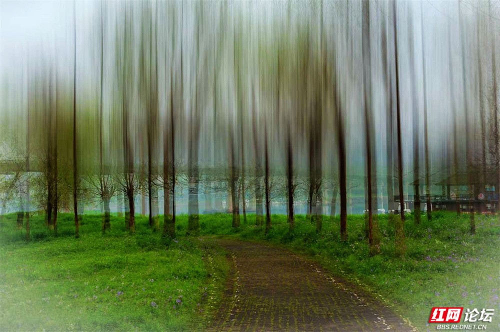 柳枝垂下新绿的温柔,随风轻摇,像在低语。树下小径蜿蜒,砖石缝里冒出茸茸青草,星星点点的小紫花悄悄开着。有人慢慢走着,也有人停下来——看江,看树,看远天那一层薄薄的、朦胧的白。林间更是幽静。树干笔直地向着天空,下半截刷着白灰,整齐又安宁。光从疏疏的枝叶间漏下来,在草地上淌成明明暗暗的影子。空气里有青草和泥土的味道,湿润润的,像是刚下过一场细雨,又像江水送来的、看不见的雾。栈道是木头的,走过时会响起轻轻的脚步声,不高不低,刚好合着心里的节奏。往前看,是深深浅浅的绿,一直漫到江边去;回头看,是城市远远的轮廓,淡在春天的雾气里。