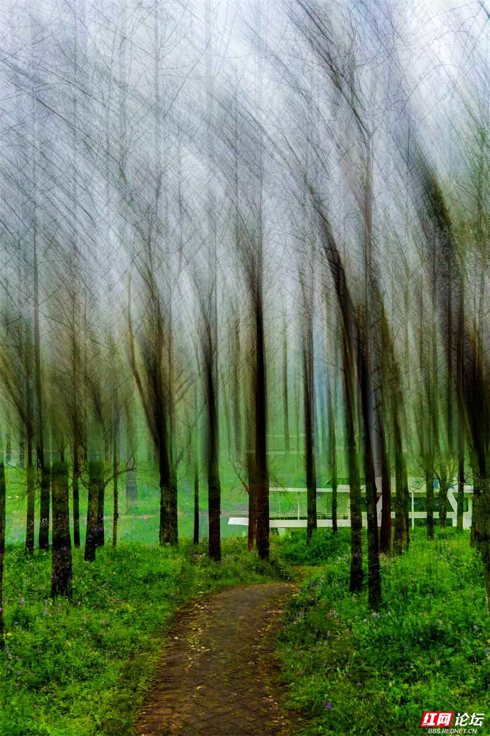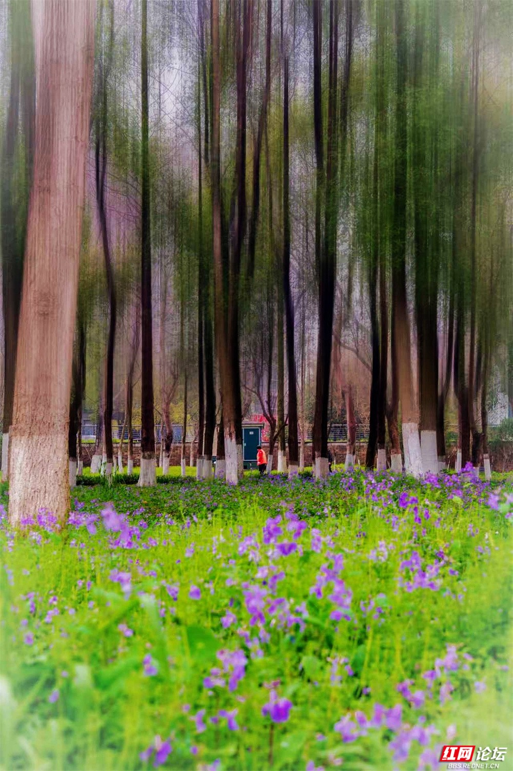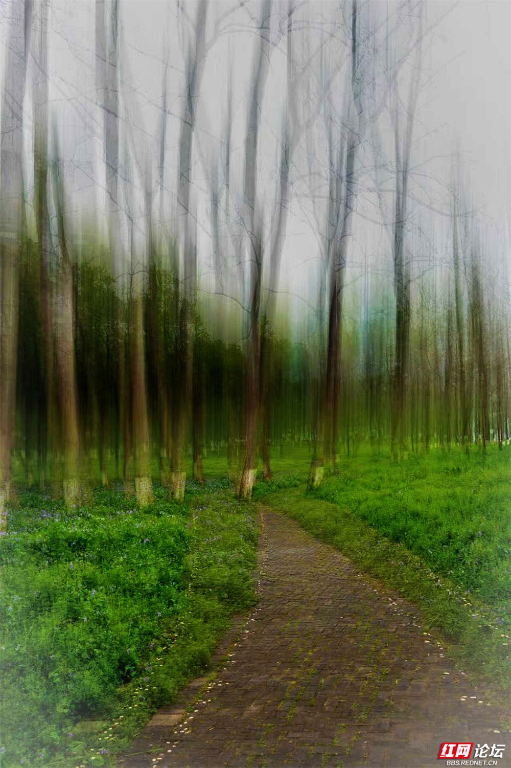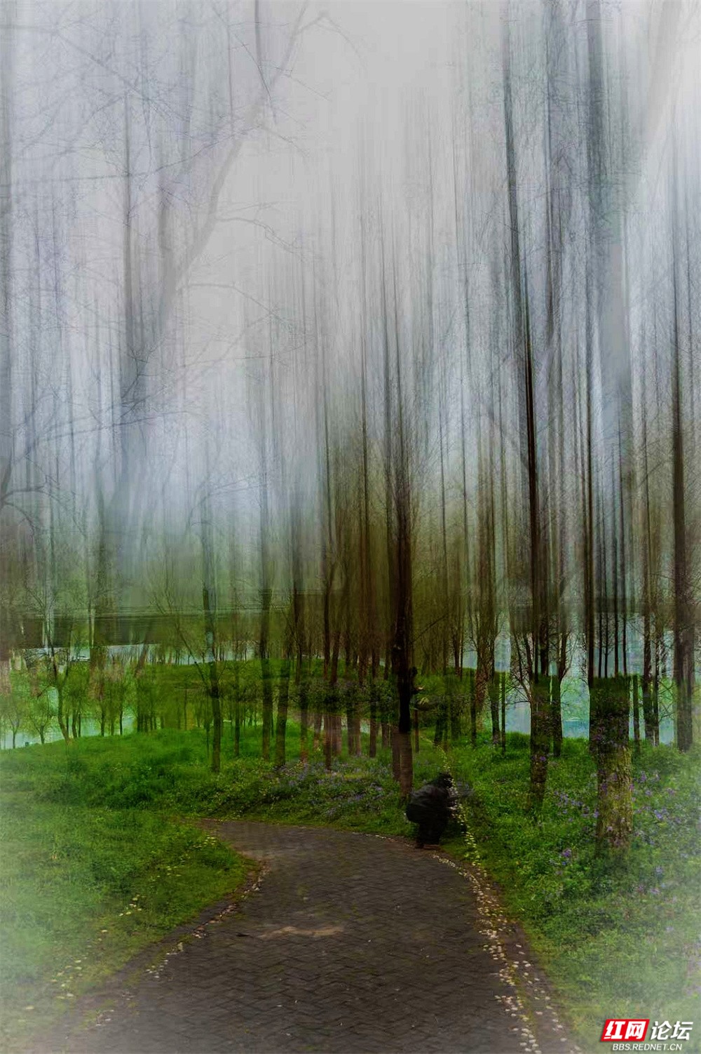 柳枝垂下新绿的温柔,随风轻摇,像在低语。树下小径蜿蜒,砖石缝里冒出茸茸青草,星星点点的小紫花悄悄开着。有人慢慢走着,也有人停下来——看江,看树,看远天那一层薄薄的、朦胧的白。林间更是幽静。树干笔直地向着天空,下半截刷着白灰,整齐又安宁。光从疏疏的枝叶间漏下来,在草地上淌成明明暗暗的影子。空气里有青草和泥土的味道,湿润润的,像是刚下过一场细雨,又像江水送来的、看不见的雾。栈道是木头的,走过时会响起轻轻的脚步声,不高不低,刚好合着心里的节奏。往前看,是深深浅浅的绿,一直漫到江边去;回头看,是城市远远的轮廓,淡在春天的雾气里。