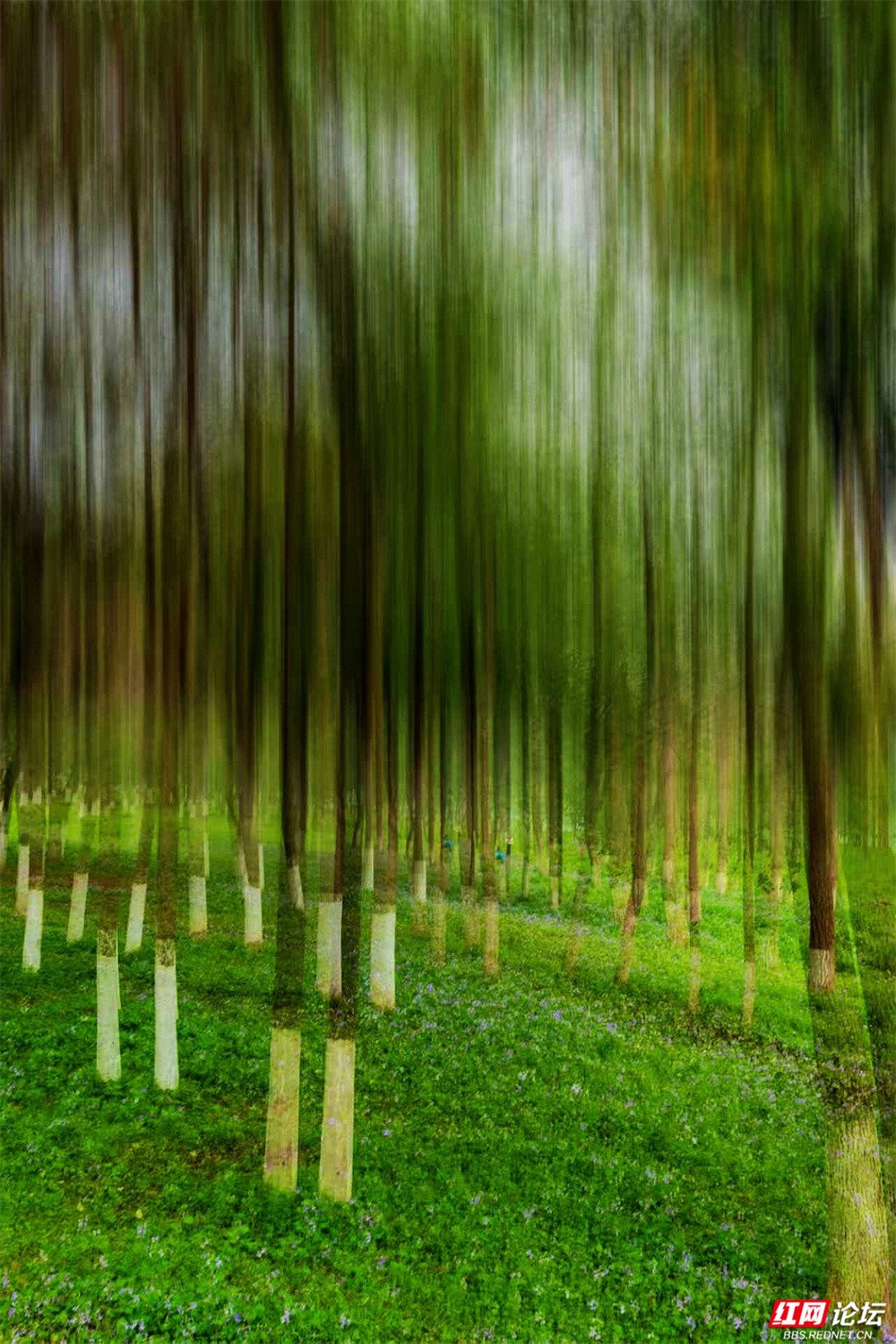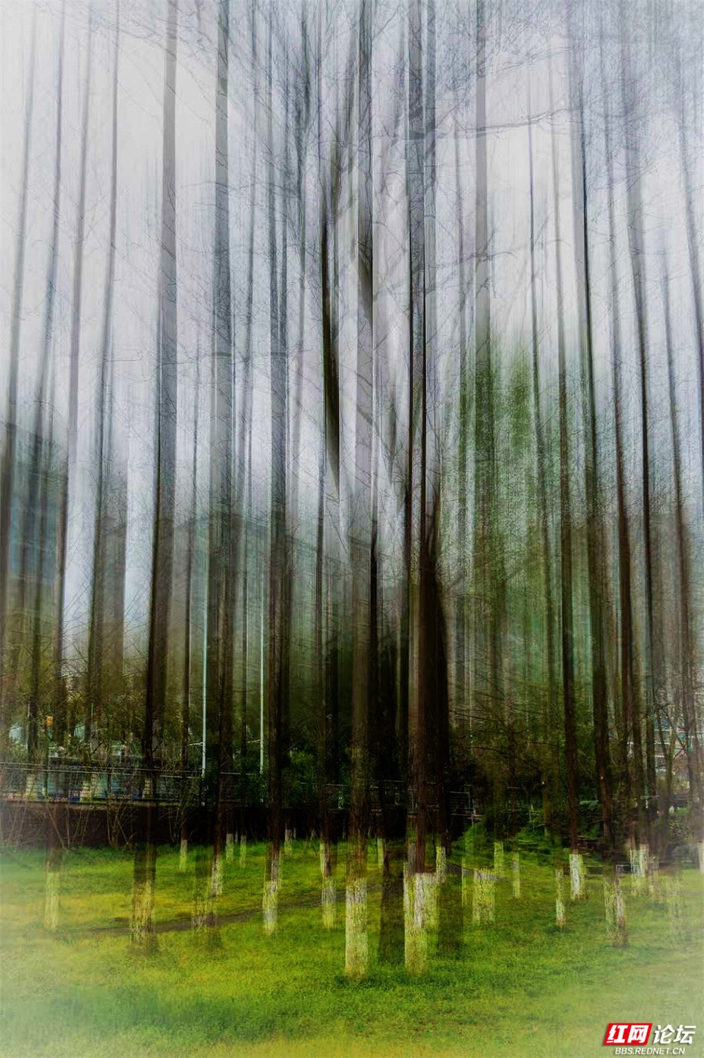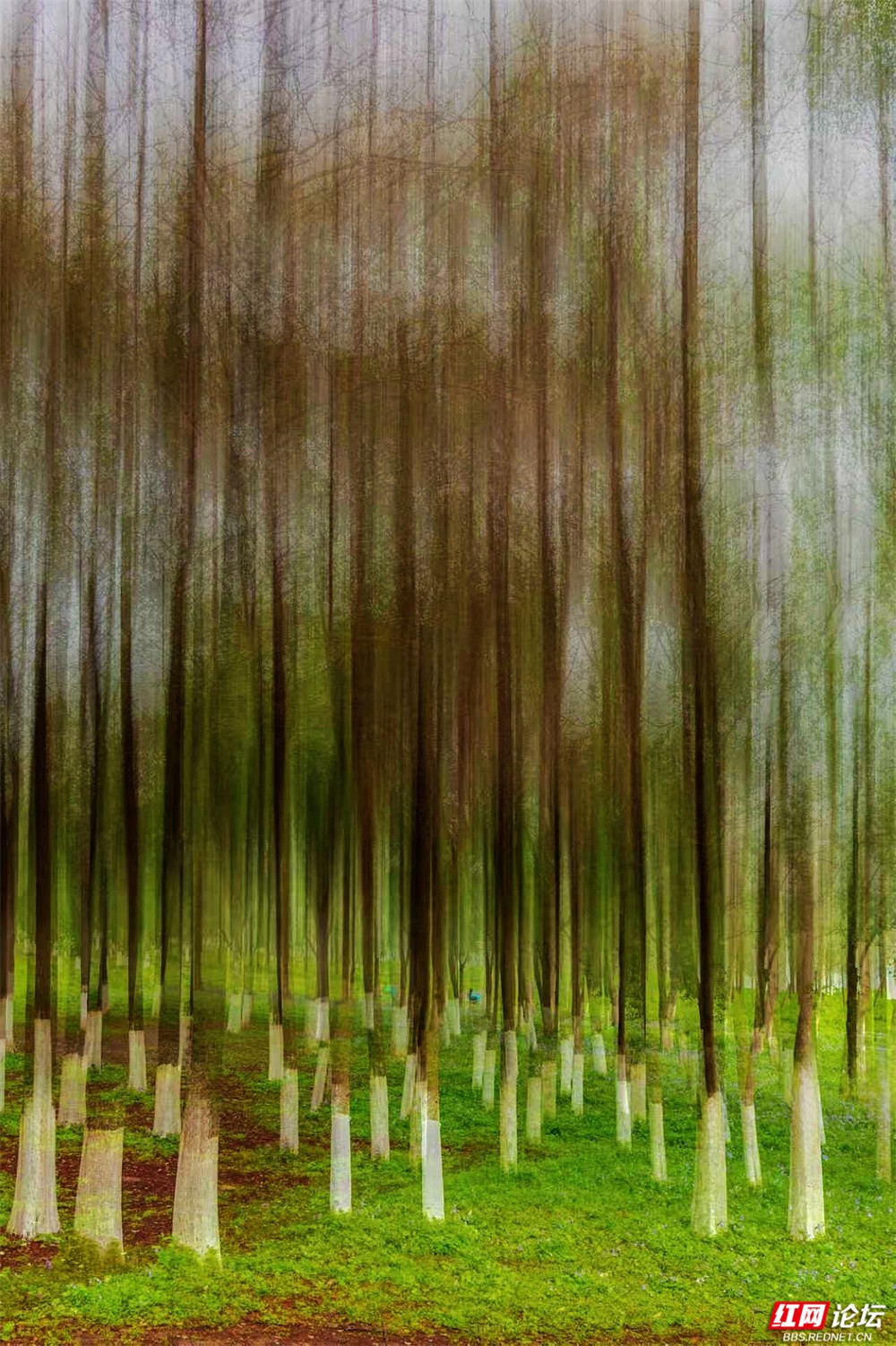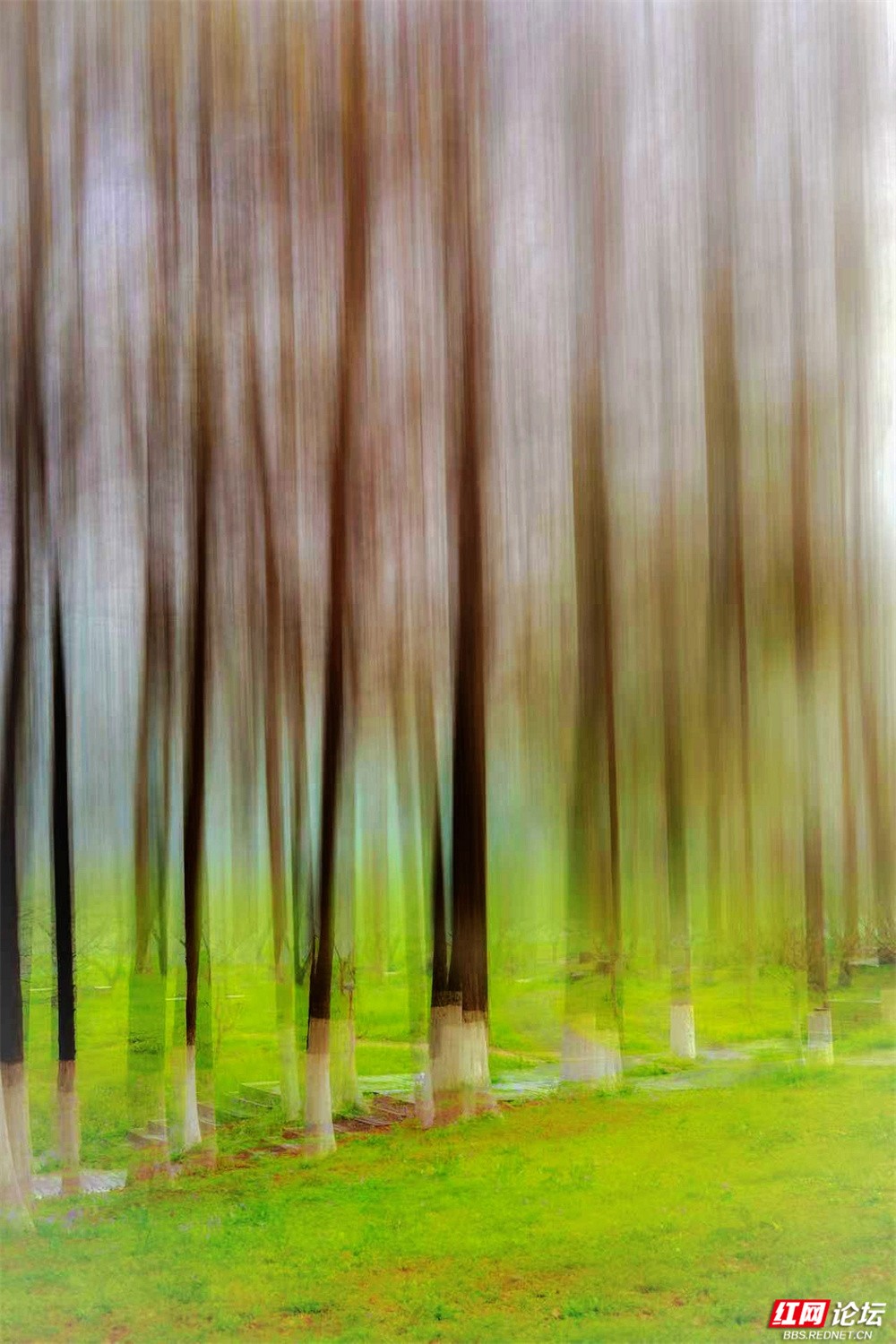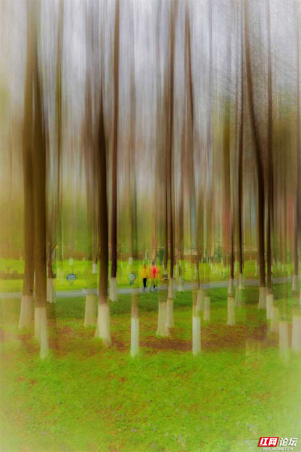 柳枝垂下新绿的温柔,随风轻摇,像在低语。树下小径蜿蜒,砖石缝里冒出茸茸青草,星星点点的小紫花悄悄开着。有人慢慢走着,也有人停下来——看江,看树,看远天那一层薄薄的、朦胧的白。林间更是幽静。树干笔直地向着天空,下半截刷着白灰,整齐又安宁。光从疏疏的枝叶间漏下来,在草地上淌成明明暗暗的影子。空气里有青草和泥土的味道,湿润润的,像是刚下过一场细雨,又像江水送来的、看不见的雾。栈道是木头的,走过时会响起轻轻的脚步声,不高不低,刚好合着心里的节奏。往前看,是深深浅浅的绿,一直漫到江边去;回头看,是城市远远的轮廓,淡在春天的雾气里。