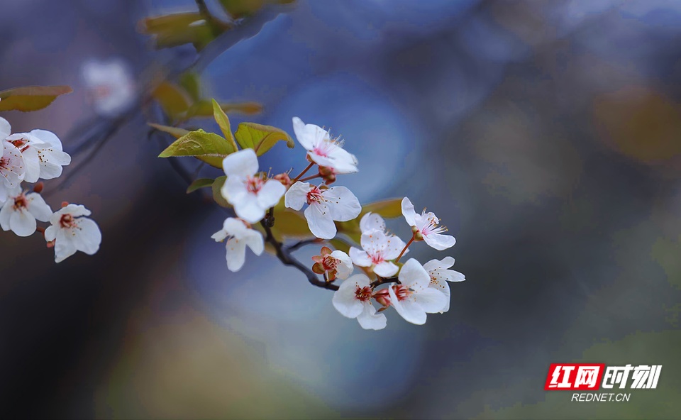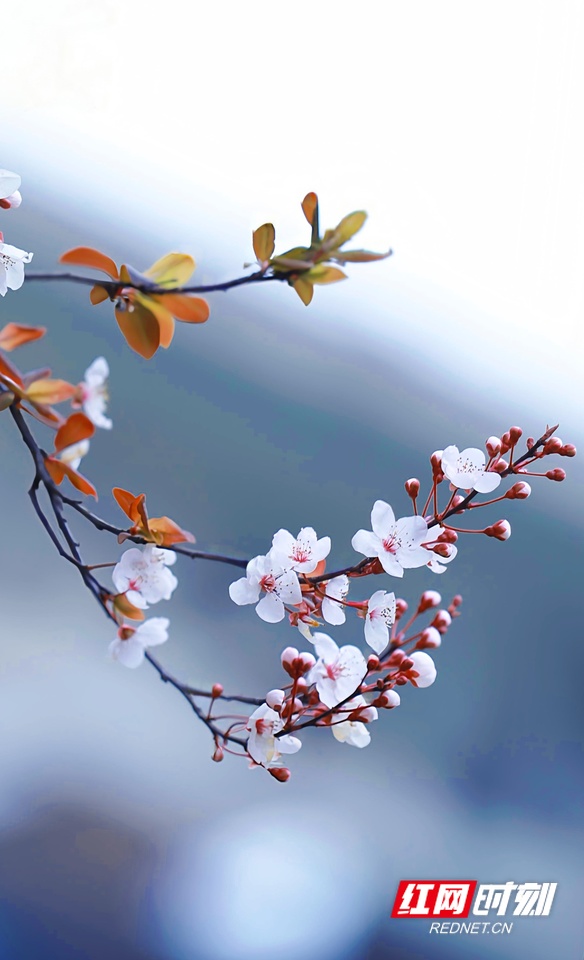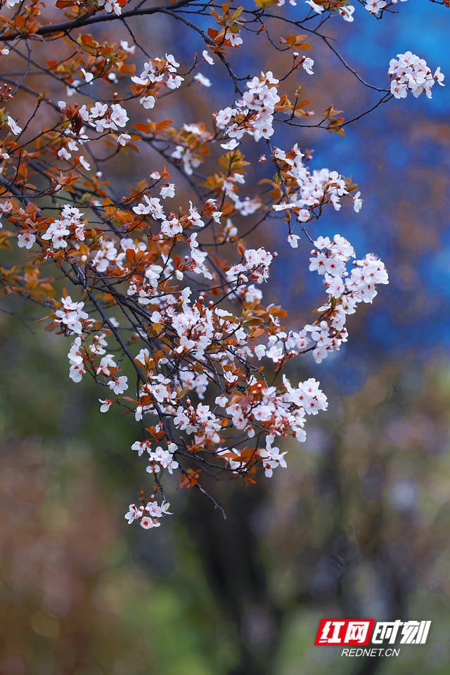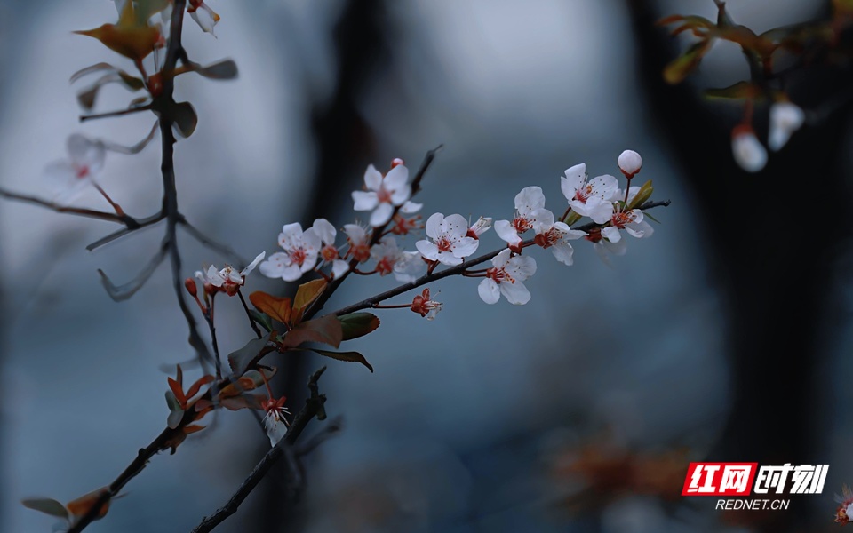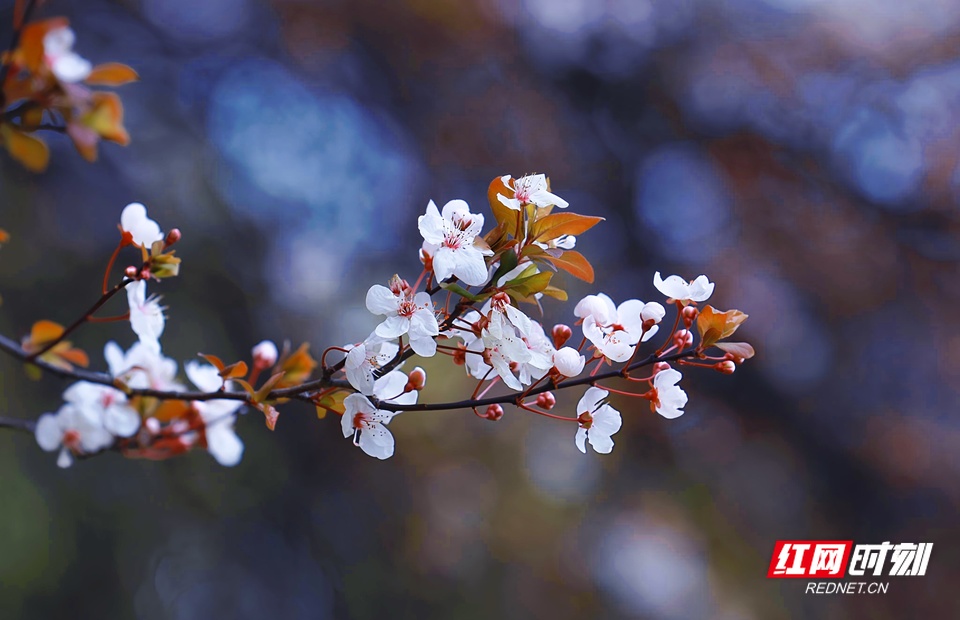 红叶李花迎春绽放。