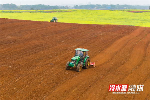在冷水滩区伊塘镇永州市柑桔示范场四工区,农机轰鸣作响,多台大型机械联合作业,高效完成翻耕、平地、施肥、起垄等作业,为红薯适时播种、稳产丰产打下坚实基础。作为冷水滩区旱粮种植示范基地,这里立足湘南红壤旱地特点,通过科学筛选适配品种、精准规划茬口衔接,创新探索“甘薯+秋鲜食玉米+菜油两用油菜”轮作模式,成功破解红壤酸性强、肥力不足的种植难题,实现红壤旱地“一年三收”,让闲置旱地变身“聚宝盆”,大幅提升土地利用效率和种植效益。