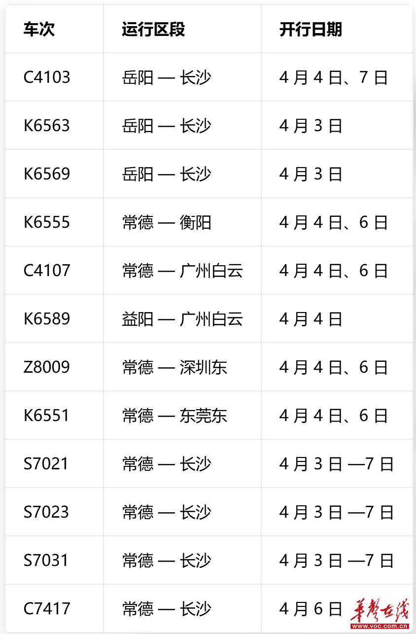 2026年清明假期临近,踏青出游、短途旅行、探亲访友与学生往返客流叠加,铁路即将迎来出行高峰。30日,记者从广铁集团长沙车务段获悉,为全力保障旅客出行需求,4月3日至8日,岳阳、常德、益阳站将增开12趟始发临时旅客列车。