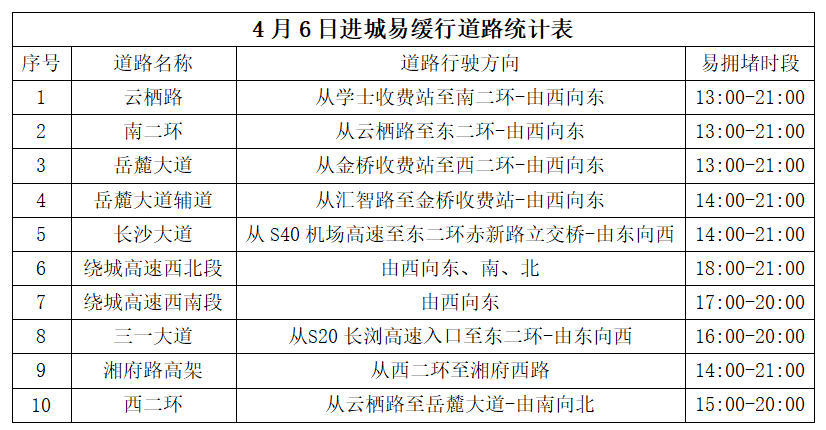 进出城通道将出现三波车流高峰:4月3日15时至20时为节前出城高峰,17时至19时达到峰值,云栖路、南二环、岳麓大道、长沙大道等10条道路出城方向易出现缓行。4月4日9时至12时为出城小高峰,云栖路、岳麓大道等7条路段通行压力较大。4月6日13时至21时为集中返程高峰,18时达到峰值,云栖路、岳麓大道、长沙大道等10条道路进城方向易出现长距离缓行,21时后交通逐步恢复正常。