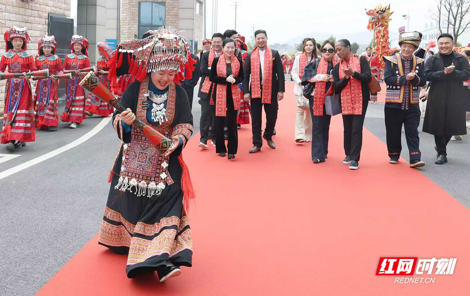 李洪梅和员工用瑶族特色仪式欢迎嘉宾。