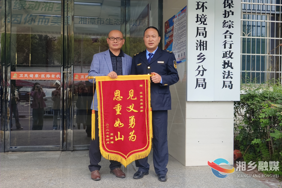 8日上午,获救群众的家属专程赶到湘潭市生态环境局湘乡分局,将一面印有“见义勇为 恩重如山”的锦旗亲手送到了蒋绪新手中,并对陈鹏志、易加星两位保洁队员表达了深深的谢意。
