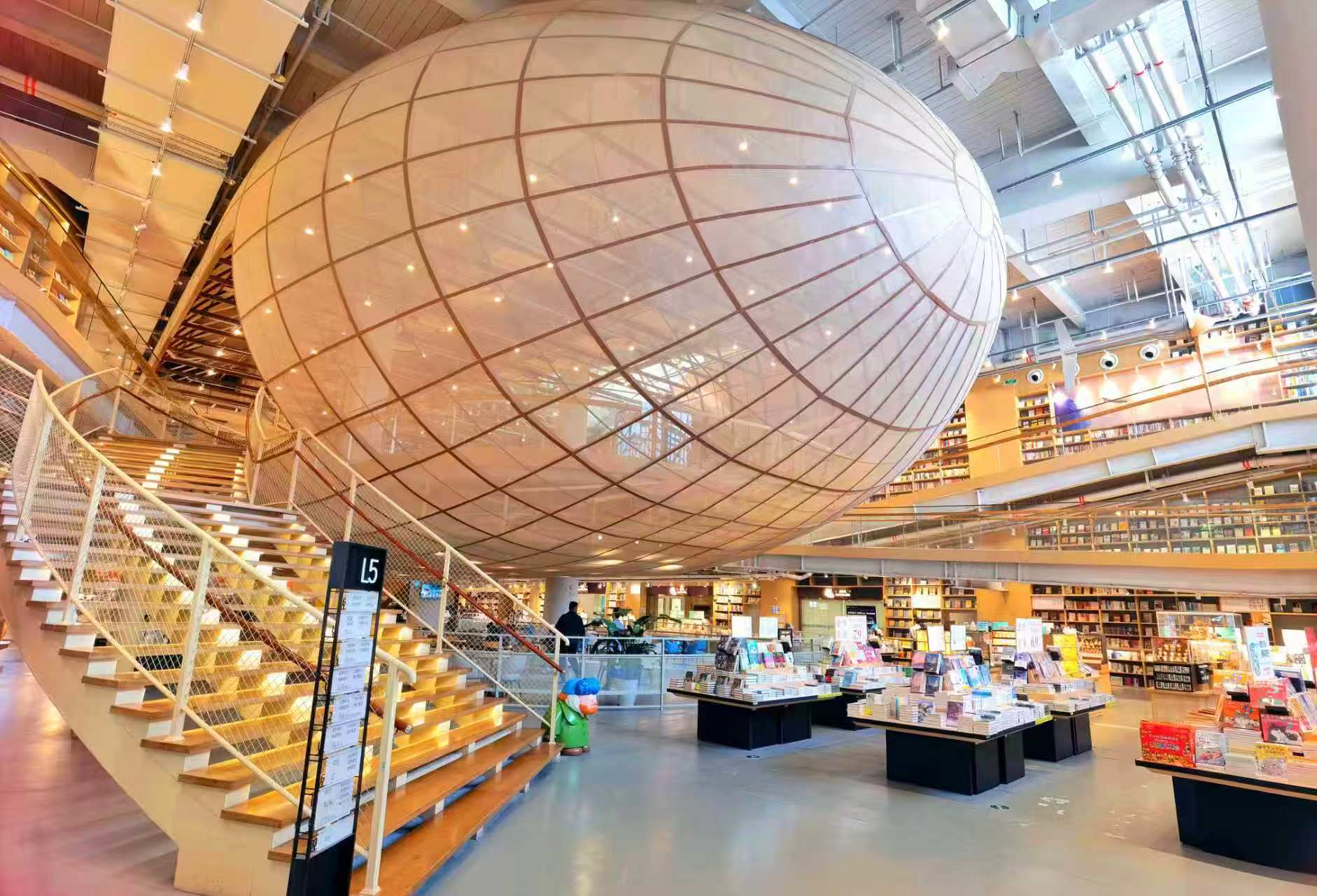 ✨书店介绍:定位于城市家庭大书房,融合阅读、咖啡、文创、亲子、文化活动等多元业态。进入书店,最先感知到的是扑面而来的未来感,一艘将近400平米的巨型飞艇悬浮于空中,仿佛正准备邀你一同去星际漫游。书店营业面积1800平米,其中图书面积1000平米,高达12米的巨型书墙在空间中错落有序地排列开来。在空间场景上,规划设计了覔玩意、覔咖啡、小小覔等多个主题场馆。在这里,你可以邂逅各种文化展览、大咖座谈,享受与同频思想面对面交流的愉悦。书墙为林,飞艇为舟,当春风翻动书页,我们一同漫游。