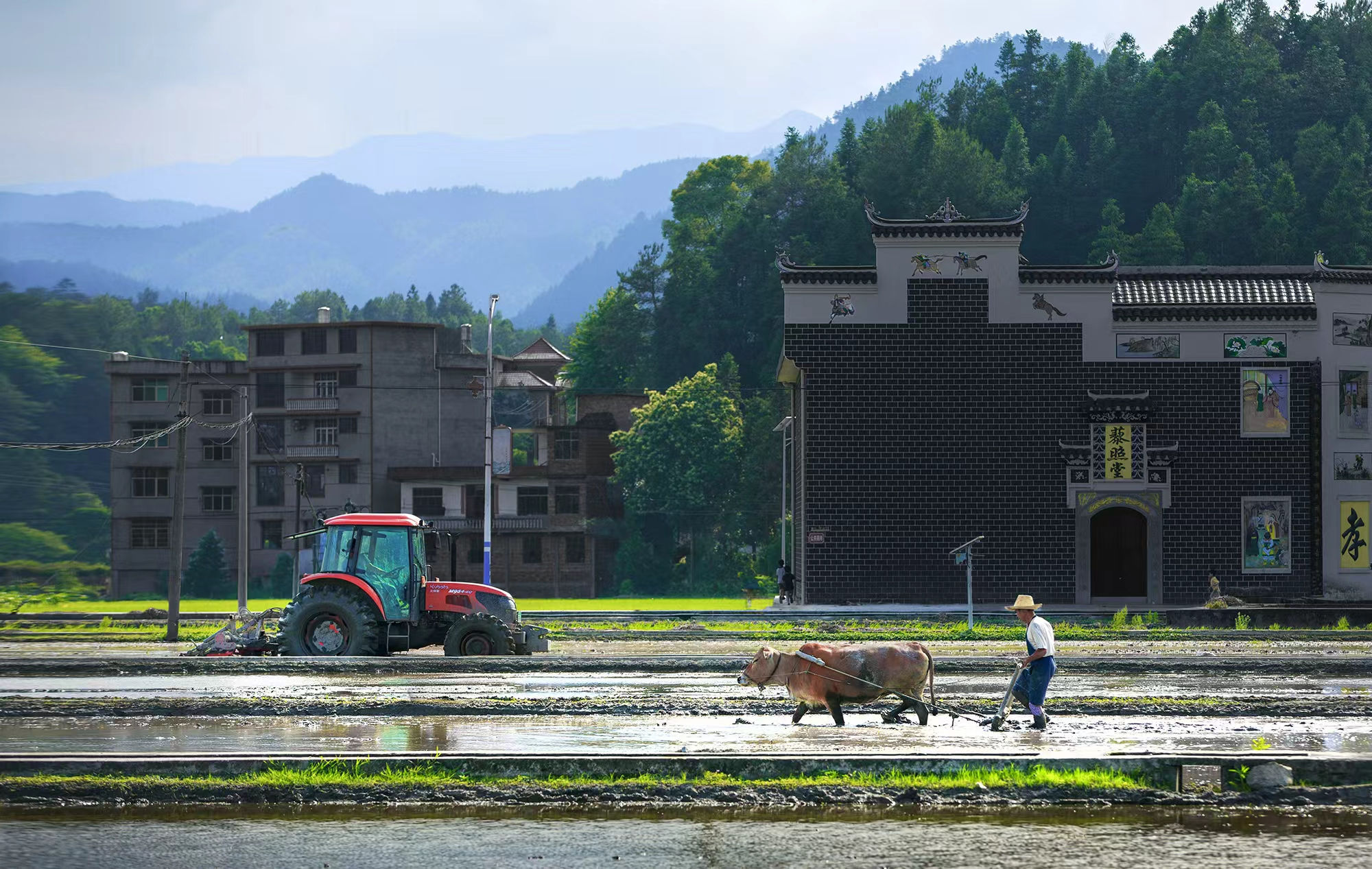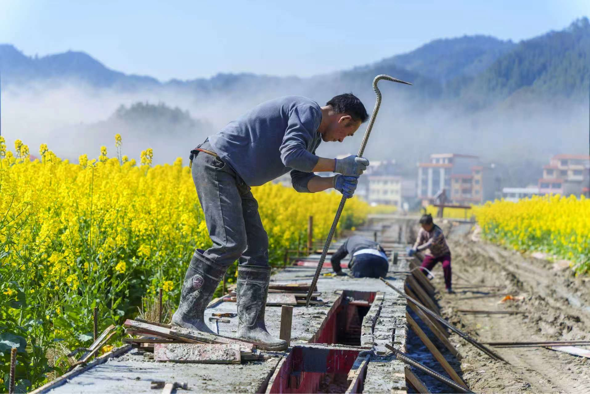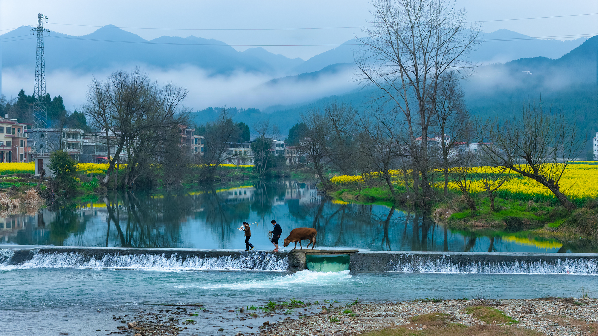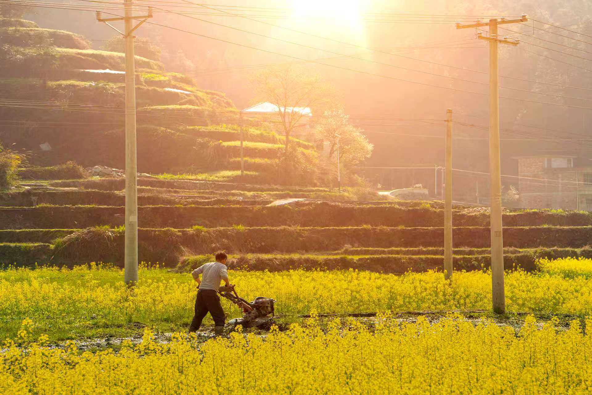 这里,明艳的油菜花是春天不变的底色,映衬着躬身劳作的身影。传统与现代在此交织:牛犁与农机并肩,草帽与安全帽同行,潺潺的水坝声和机器的轰鸣,合奏出乡村振兴的序曲。