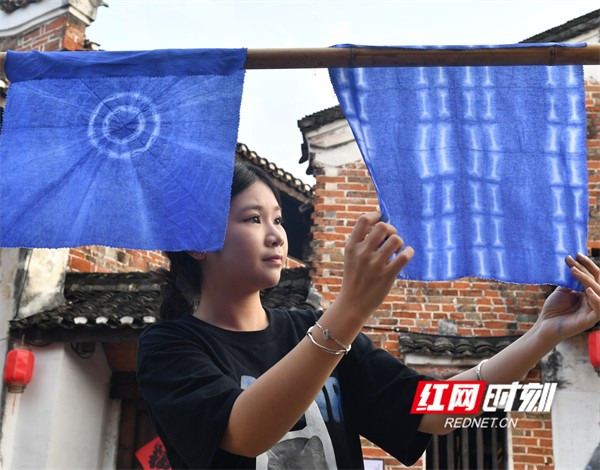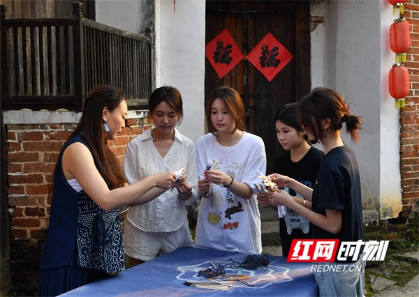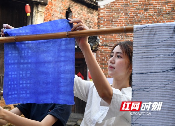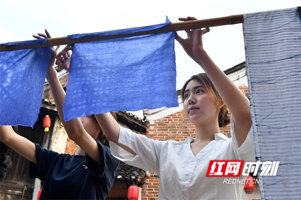 红网时刻新闻4月20日讯(通讯员 黄海)4月19日,江永县勾蓝瑶寨,非遗蓝靛扎染技艺手艺人周佳佳,为前来研学的4名女大学生们带来了一堂沉浸式传统扎染技艺课。青砖黛瓦的古瑶寨院落里,红灯笼与木质古建筑相映成趣,靛蓝染缸、素色棉麻布匹与青年学子的身影交织,勾勒出非遗活态传承的鲜活图景。