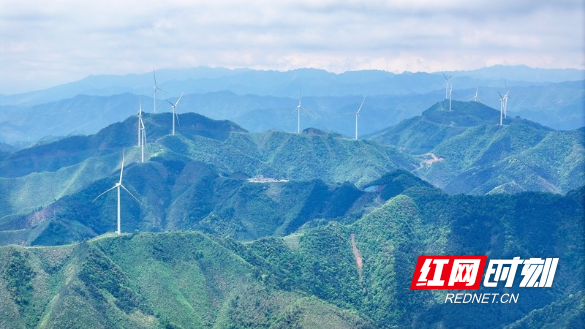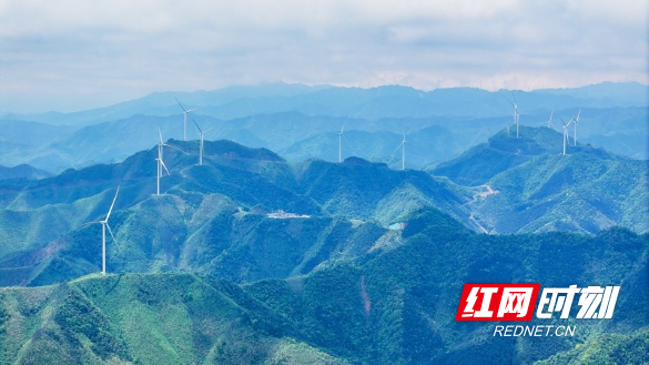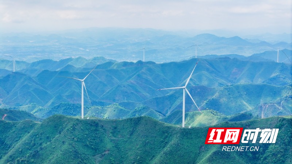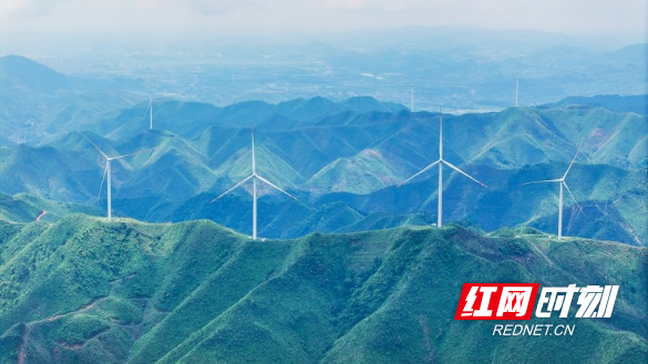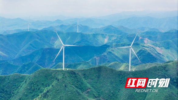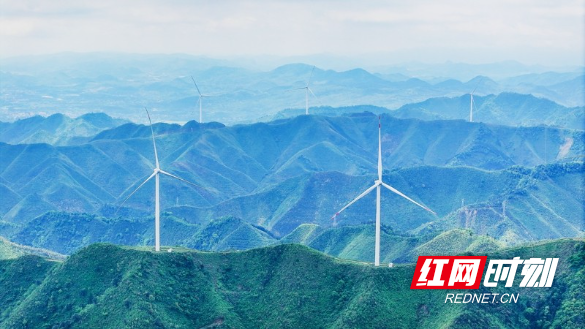 红网时刻新闻4月24日讯(通讯员 刘贵雄 陈祉凝)4月23日,湖南省永州市新田县门楼下瑶族乡九峰山绿意盎然,山峦重叠,数十台风力发电机矗立在山间,壮美如画。