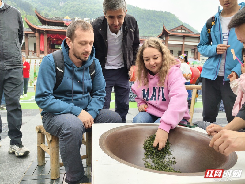 红网时刻新闻4月25日讯(记者 何超 通讯员 张洪涛)4月24日,张家界武陵源吴家峪门票站广场变身沉浸式茶文化民俗体验区,2026武陵源首届茶旅文化周系列活动在此拉开帷幕。苗鼓迎宾、非遗展演、手工炒茶……丰富多彩的文旅融合活动,吸引了众多中外游客驻足参与。