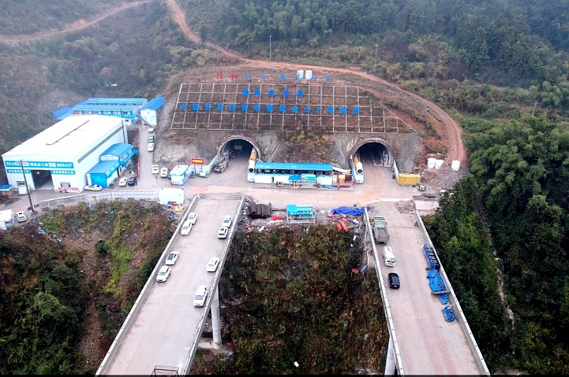 据悉,紫金山2号隧道全长4287米,为双洞双向隧道,设计时速100公里,采用双向开挖方式。进口端受“山、谷、河”格局制约,场地布置极难;出口端下临河道与207国道,需在30米高悬崖搭设平台,进洞风险极高。为解决这一难题,项目邀请专家现场踏勘论证,确定进口端“桥梁缩跨+洞门外移”、出口端“洞门后移18米+暗洞改路基”两大优化方案,既实现了双向提前进洞,又避免了进口端仰坡大面积刷坡,在保护生态、规避临崖施工风险、保障国道通行等方面取得最优解。为解决隧道水文地质复杂、断层破碎带发育、裂隙富水等问题,项目严格遵循“先探测、管超前、短进尺、弱扰动、强支护、快封闭、勤量测”原则,动态优化施工参数,最终安全顺利实现8次穿越断层破碎带。