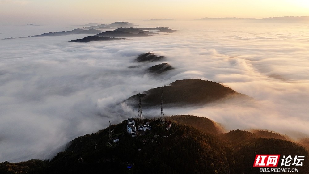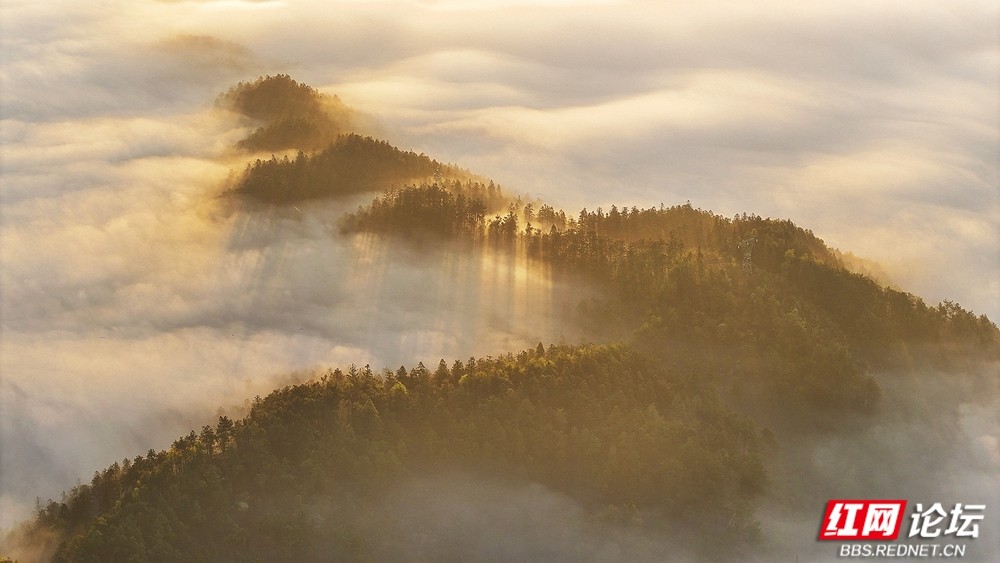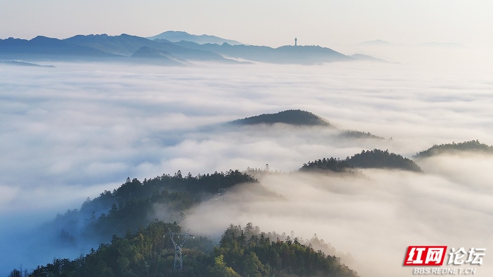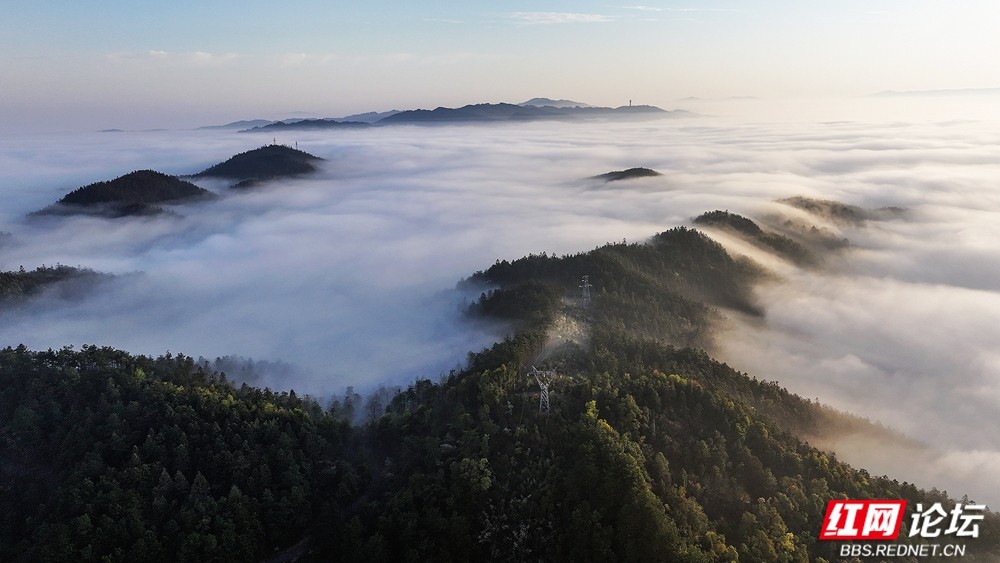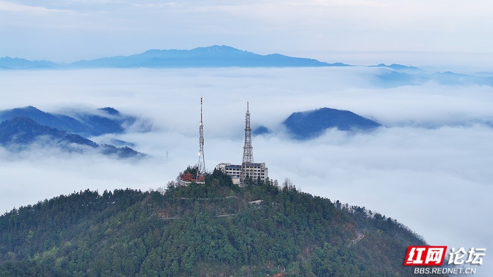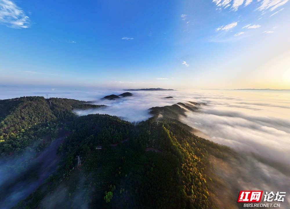 从高空俯瞰,澄澈的蓝天下,浩渺云烟铺展于群山峡谷之间。翠绿的峰峦在翻腾的云雾中浮沉,黛色的山影与洁白的云海交相辉映,意境空灵。随着气流涌动,云海时而柔美如纱,时而澎湃如潮,将满山春色装点得如梦似幻,展现了生态怀化的自然之美。