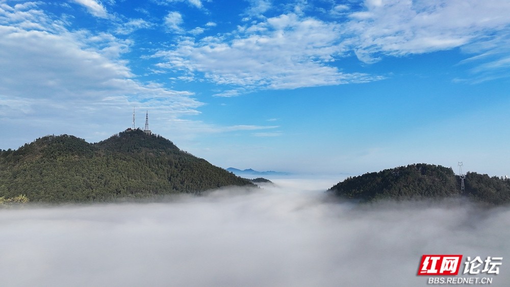 4月1日,春雨过后的怀化主城区碧空如洗,呈现出迷人的“青绿山水”画卷。在中坡山国家森林公园,壮观的云海奇观如约而至。