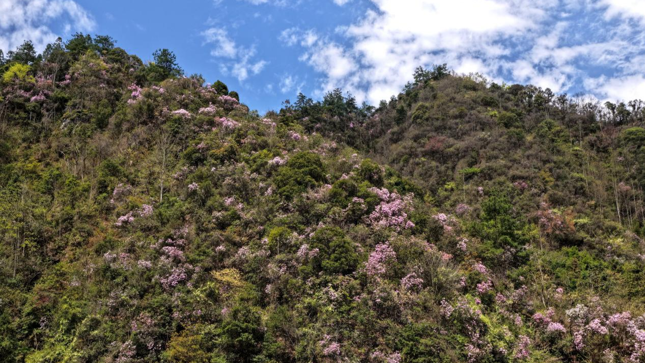 盛放的花丛自山脚绵延至海拔千米处的山腰,顺山势蜿蜒起伏,宛如浩瀚的紫色海洋。微风拂过,花浪轻摇,清香弥散,与苍翠的森林、潺潺的溪流、缭绕的山雾相映成趣,步移景异,如入仙境。