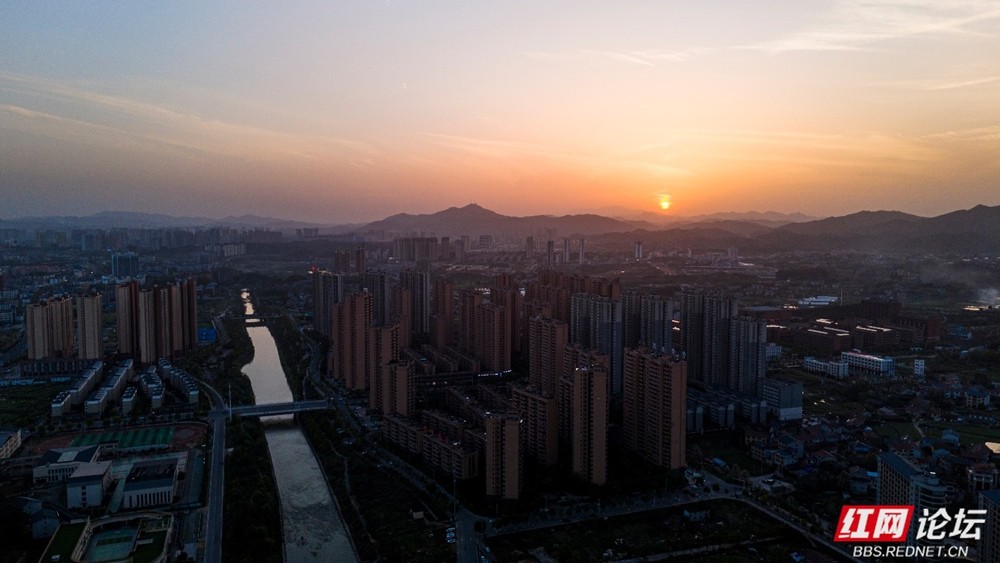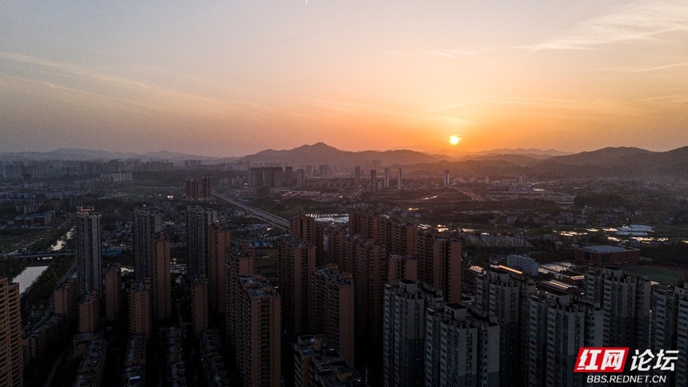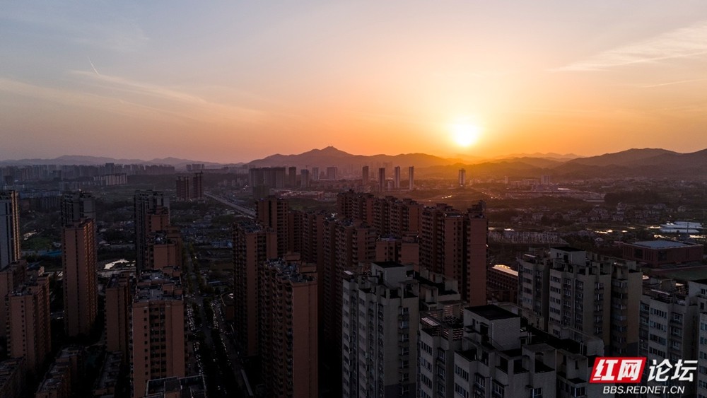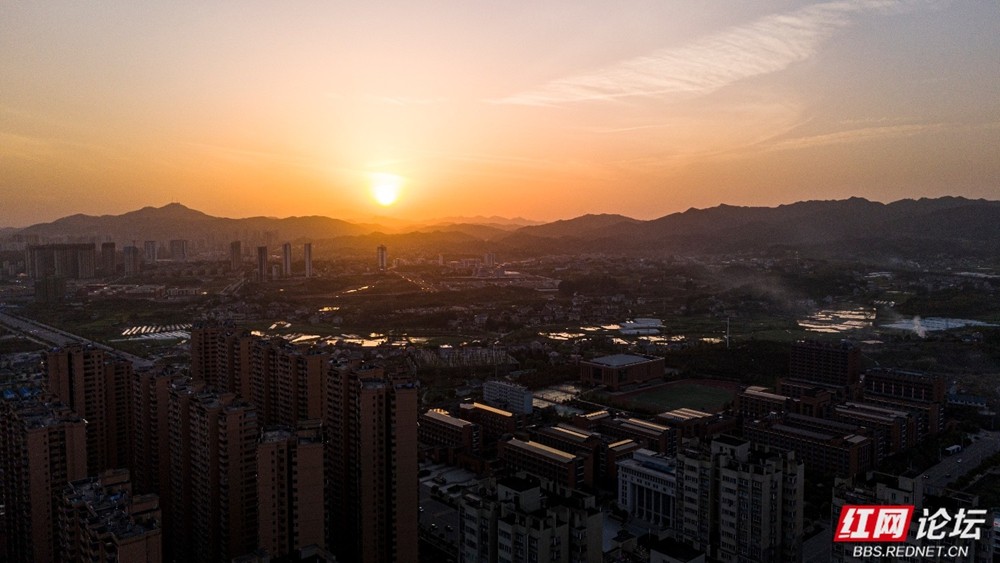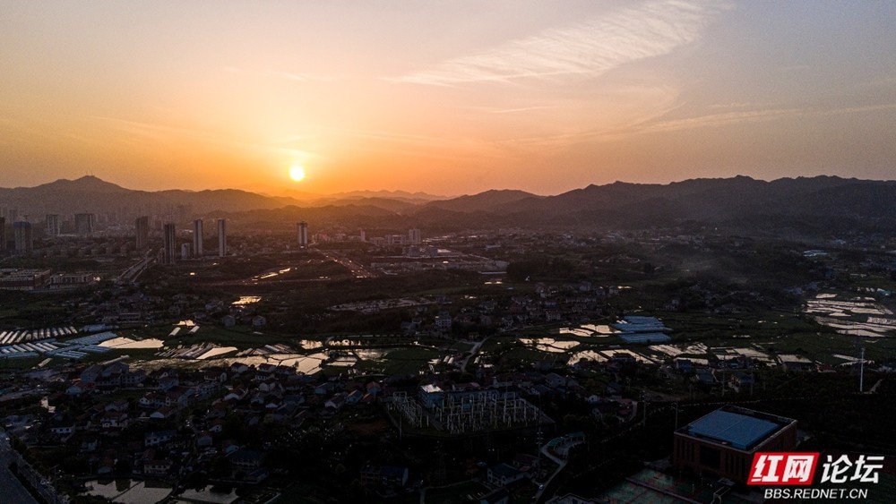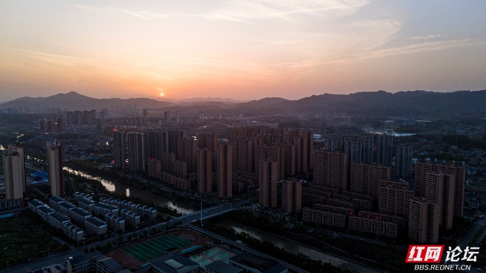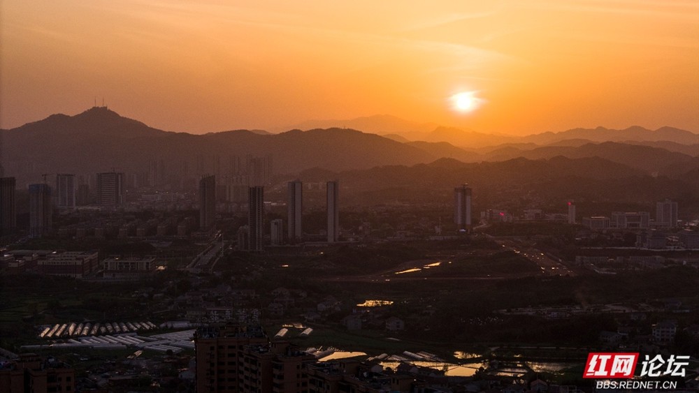 2026年4月4日,傍晚的怀化市鹤城区。夕阳正缓缓沉入远山,金橘色的余晖铺满天际,将整座城市揽入怀中。错落有致的高楼在逆光中化作深沉的剪影,与蜿蜒的河水、静谧的田畴交相辉映。