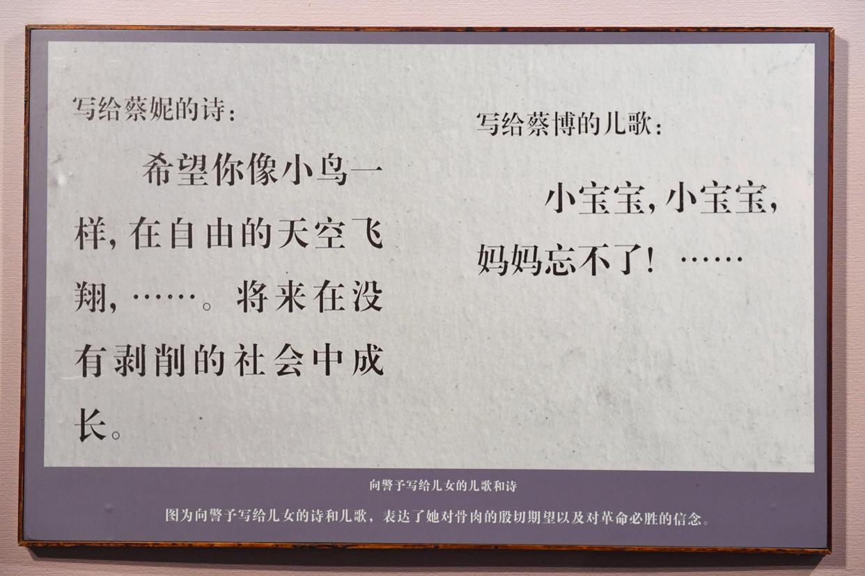 生前,向警予留给年幼儿女饱含深情的诗和儿歌:“小宝宝,小宝宝,妈妈忘不了!……”“希望你像小鸟一样,在自由的天空飞翔,……。将来在没有剥削的社会中成长。”