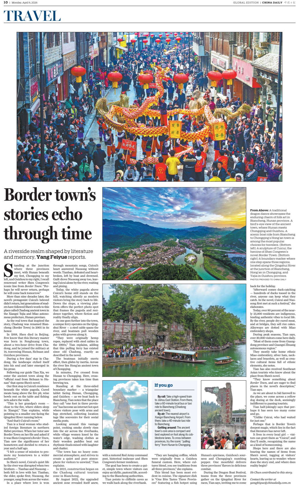 编者按:湘西边城,因作家沈从文的小说而成为著名文学地标。如今,时光流转,文学的基因深深浸入古镇的肌理、融入烟火日常,与文旅发展相得益彰。4月6日,《中国日报》第十版刊发整版报道《Border town’s stories echo through time(边城文脉岁月回响,湘西古镇文韵新生)》,记者循着沈从文的文学脉络走进边城,捕捉文学与文旅交融的鲜活瞬间,呈现这座湘西古镇在时光淬炼中延续的文化记忆和当代图景。