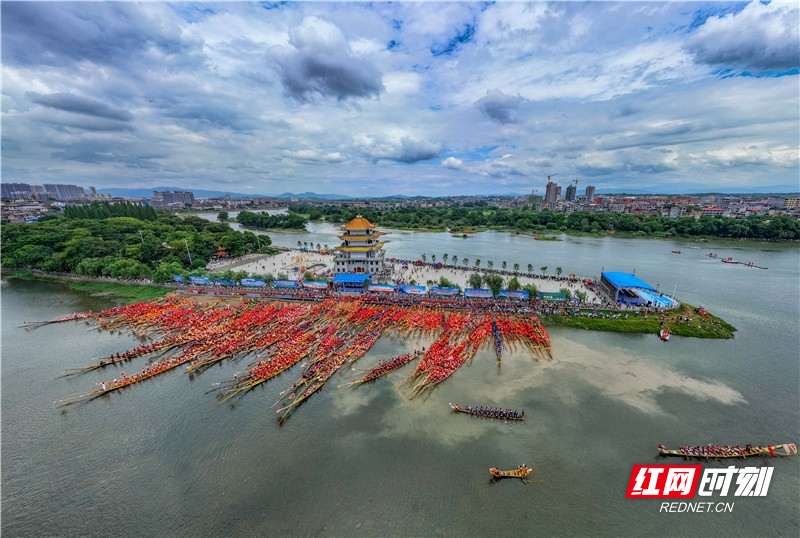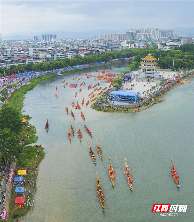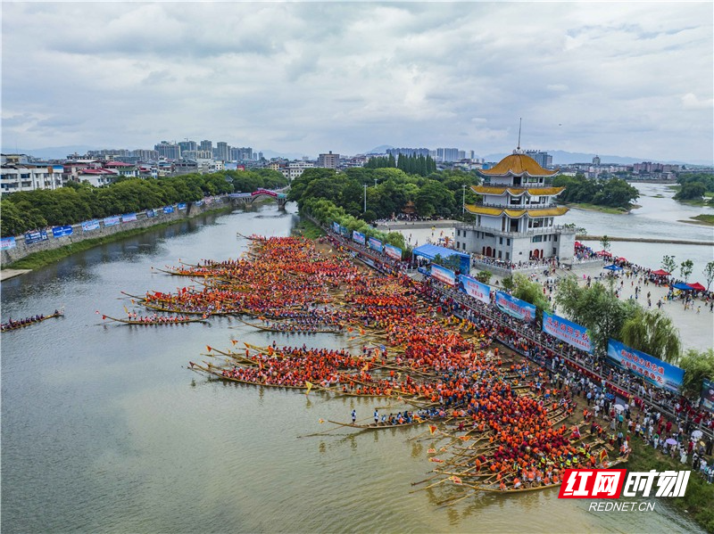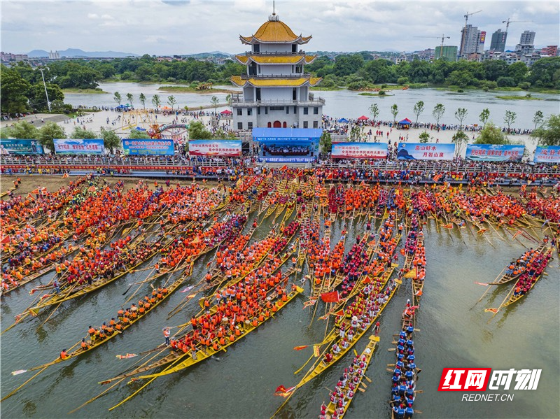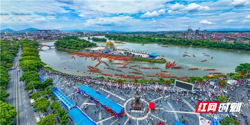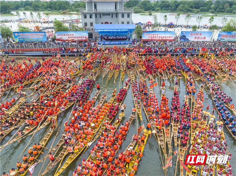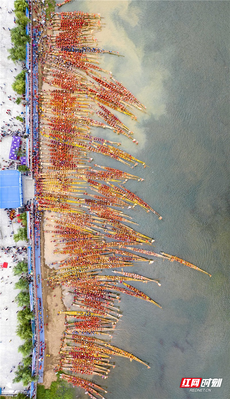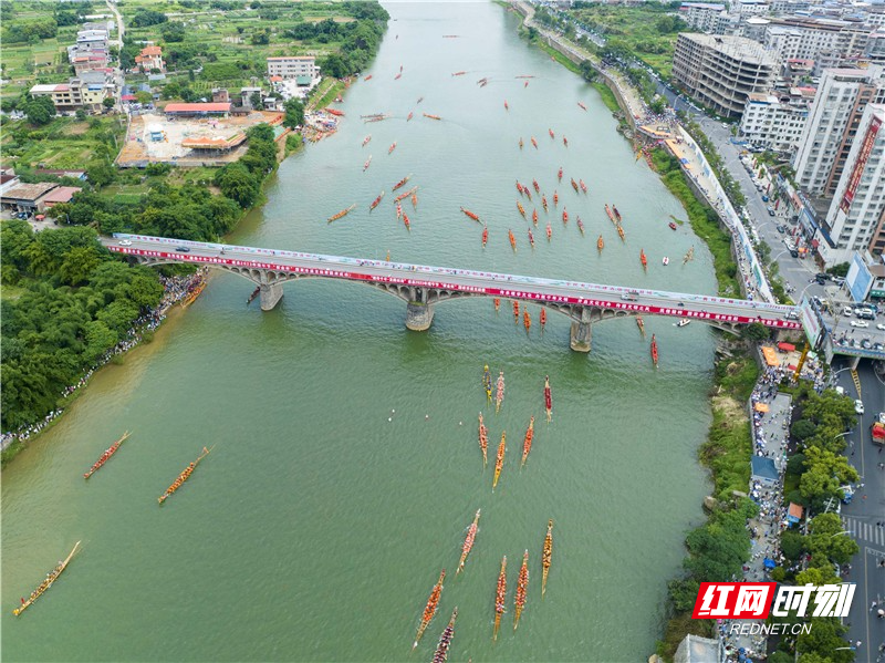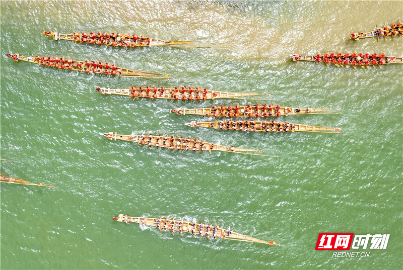 红网时刻新闻6月19日讯 (记者 姜姿 通讯员 蒋克青)6月18日,永州市道县参赛龙舟队在道县潇水河面上奋勇争先。当日,道县2023年端午节龙船赛“理传千年 龙腾四海”道县2023年端午节“紫金杯”国家非遗龙船赛鸣锣开幕。龙船赛吸引了12个乡镇(街道)、73个村(社区)、172艘龙船、4816名民间运动员参加,规模之大、队伍之多、运动员之众为历年之最。